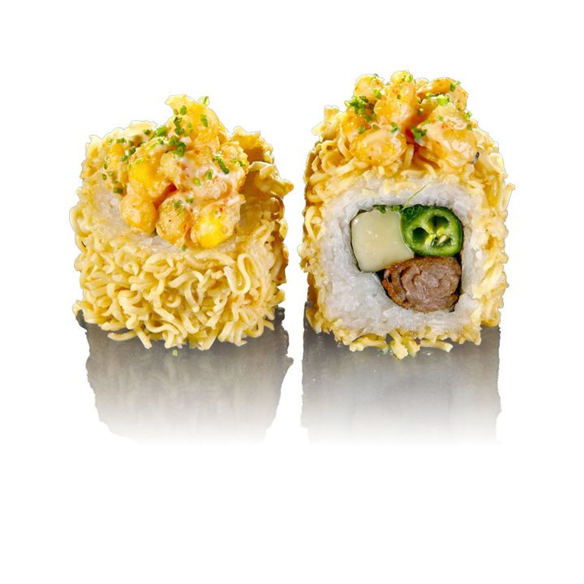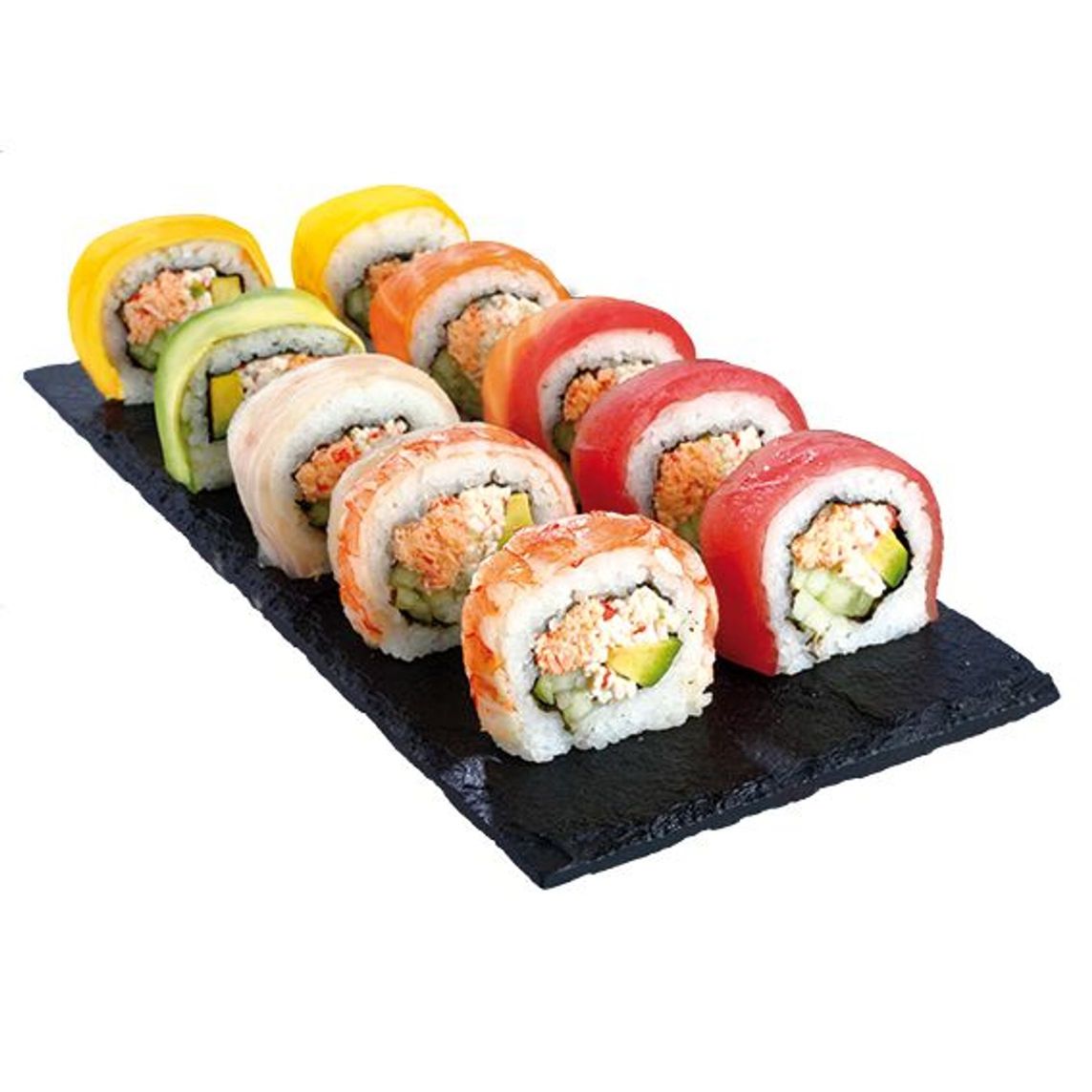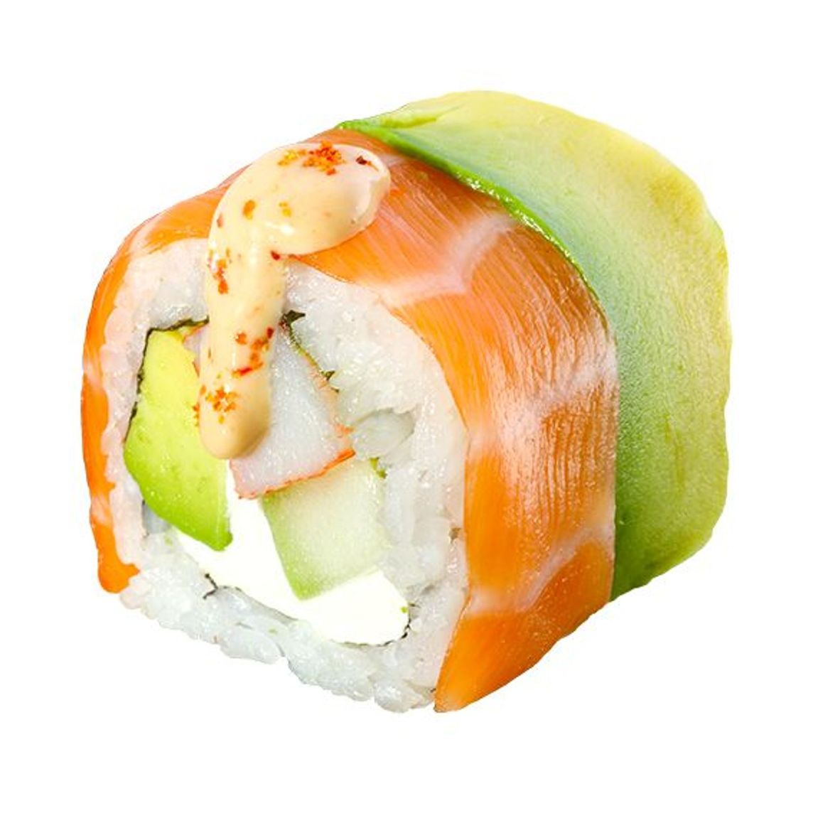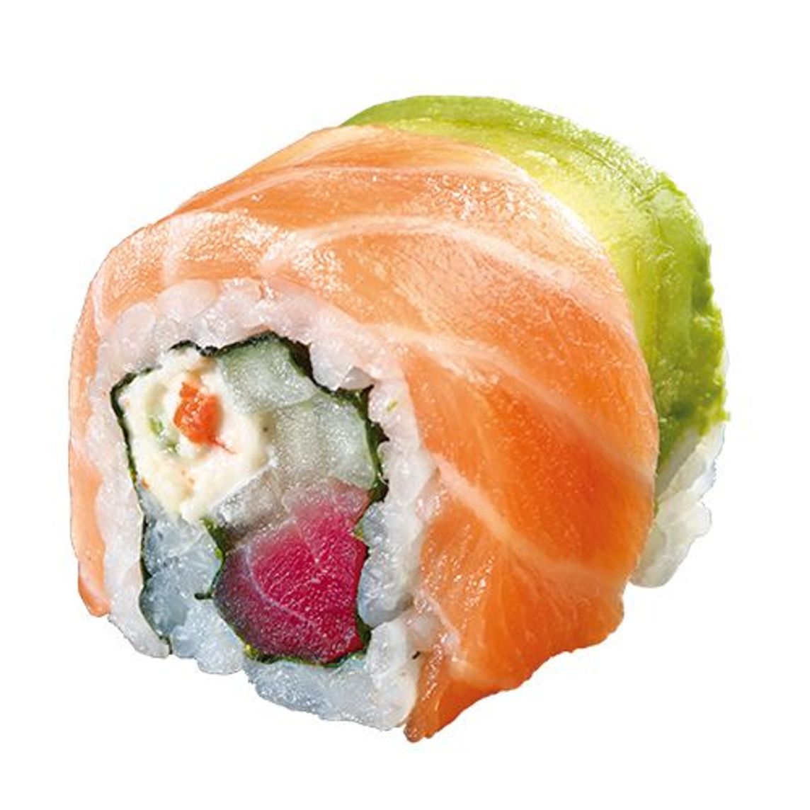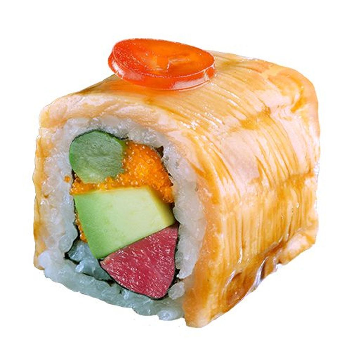 10 pzas. Topping: Queso, pepino, aguacate masago y tom-yum mayo. Por dentro: Salmón, atún, kampachi, aguacate y pepino.
