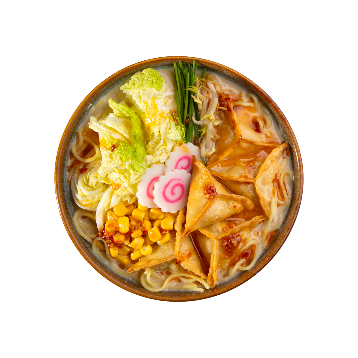 Fondo shoyu, gyozas de camarón (5 pzas.), naruto, chicoria, elote, germen de soya, cebollín y aceite de chile.