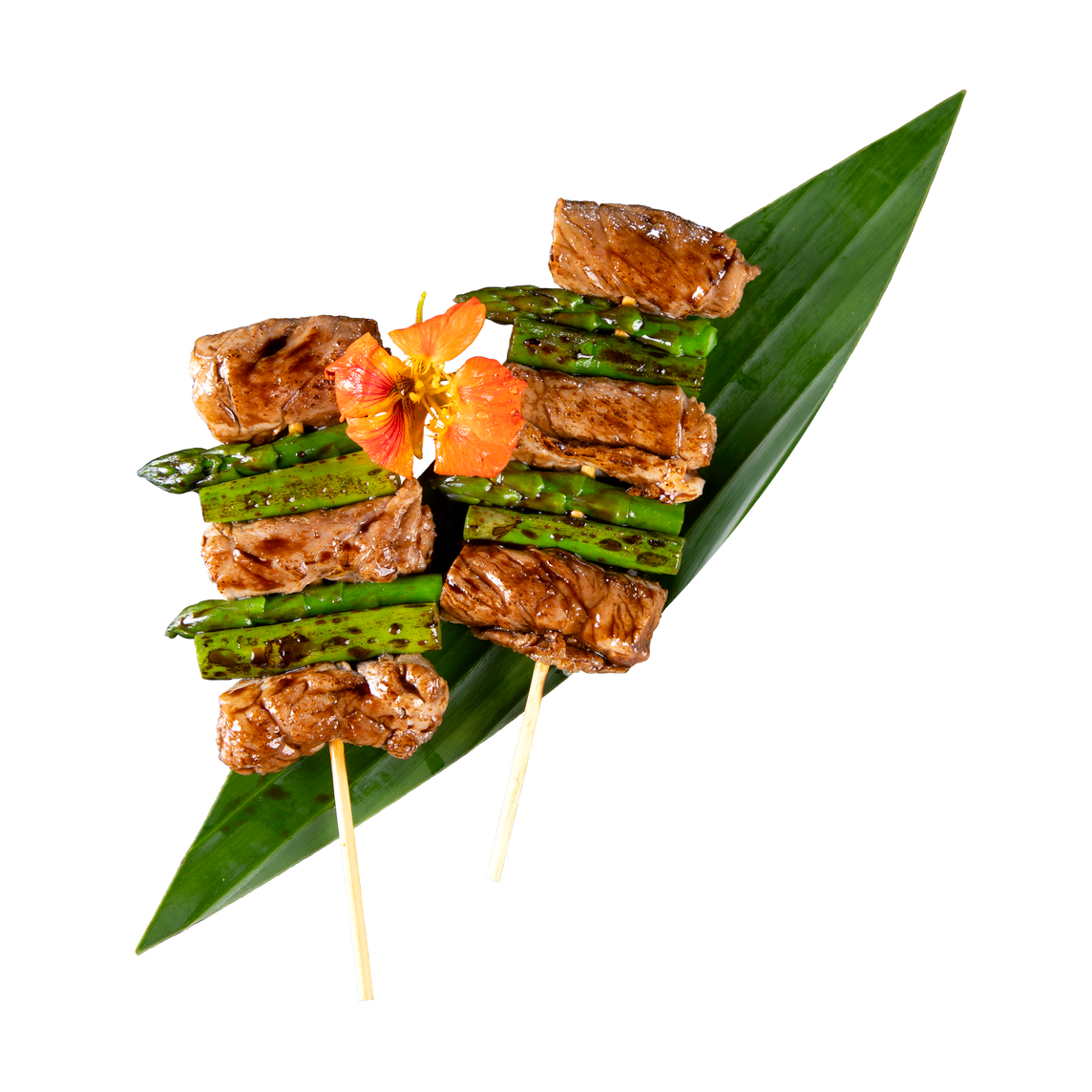 Brocheta a la parrilla con rib eye (60g), espárrago asado y salsa yakitori.