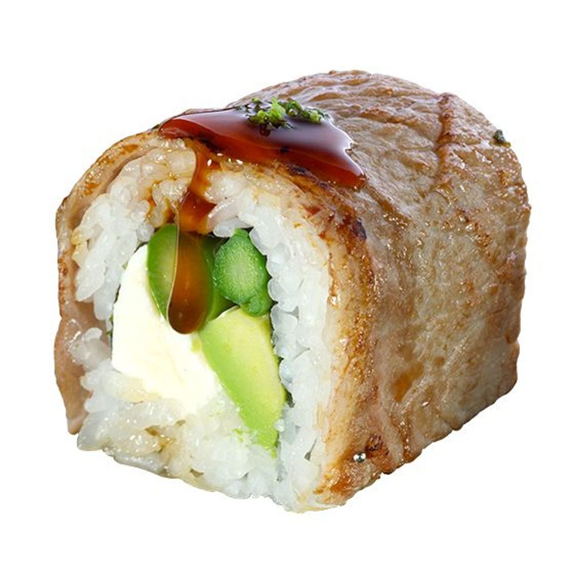 10 pzas. Topping: Rib eye y salsa teriyaki. Por dentro: Espárrago, aguacate y queso crema.