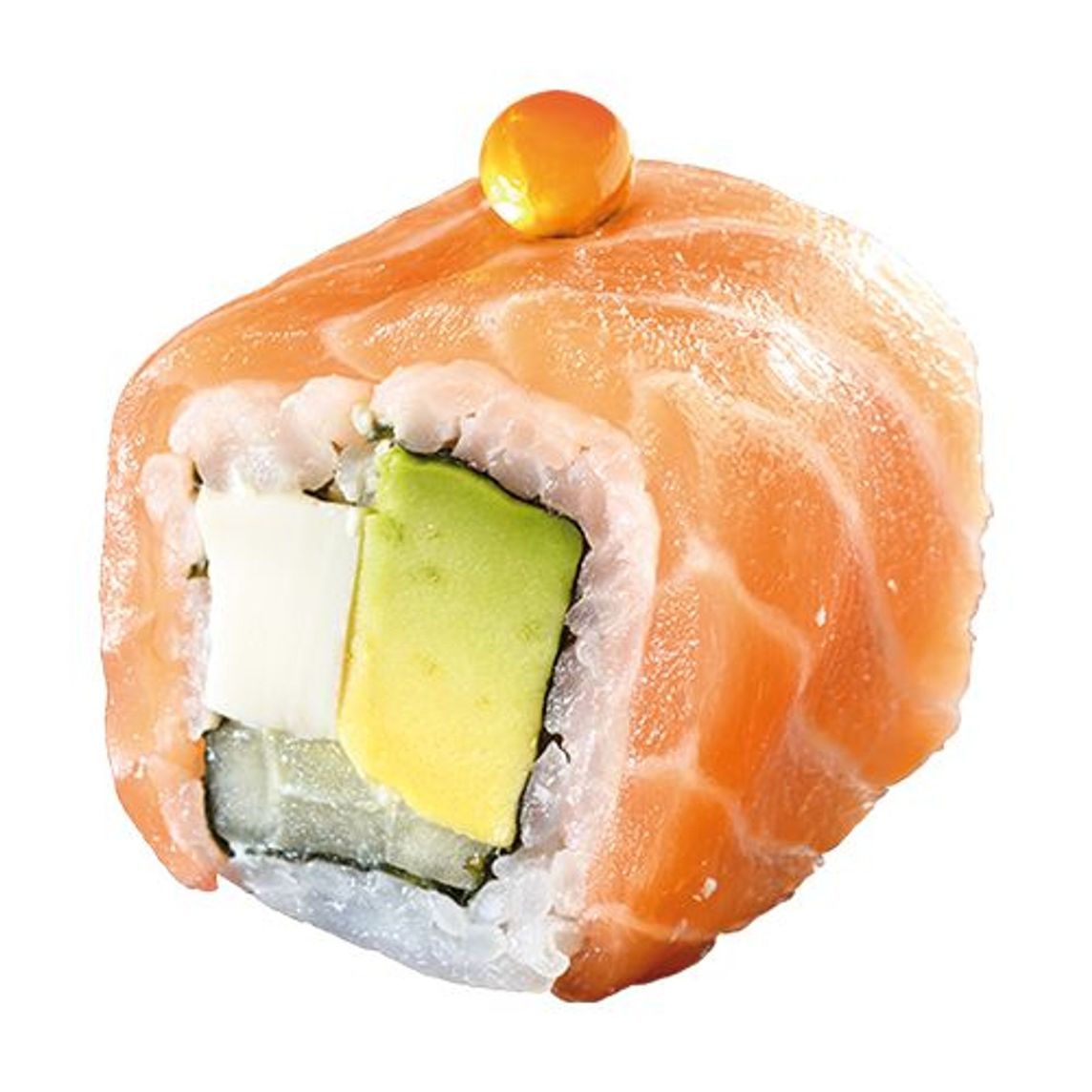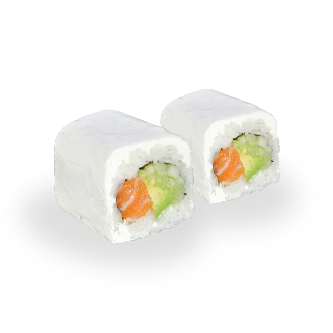 10 pzas. Topping: Salmón, aguacate y yuzu mayo. Por dentro: Cangrejo, pepino y queso.