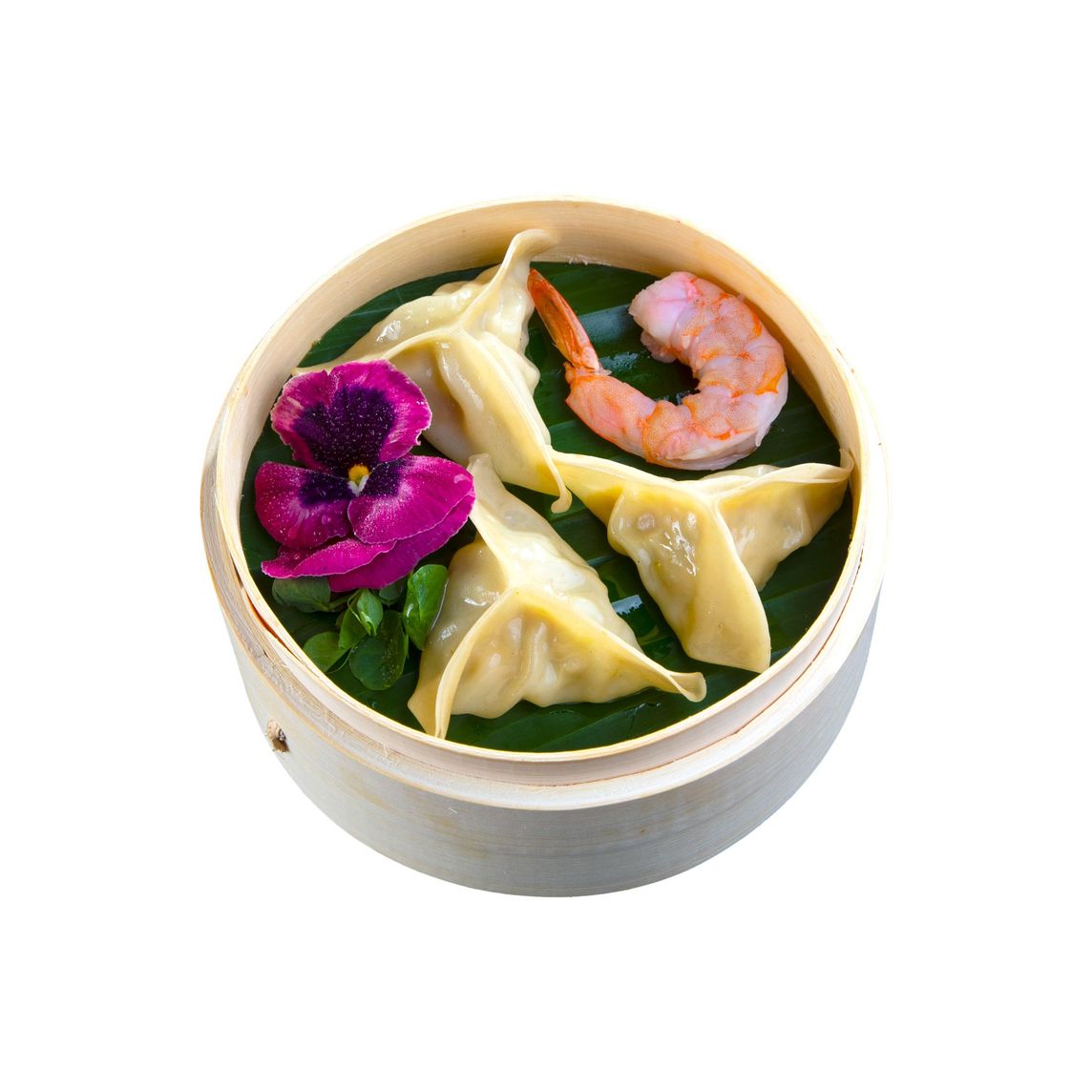 Gyozas de camarón al vapor a la plancha o fritas (3 pzas.), sobre hoja de plátano, acompañado de salsa para gyozas y flor comestible.