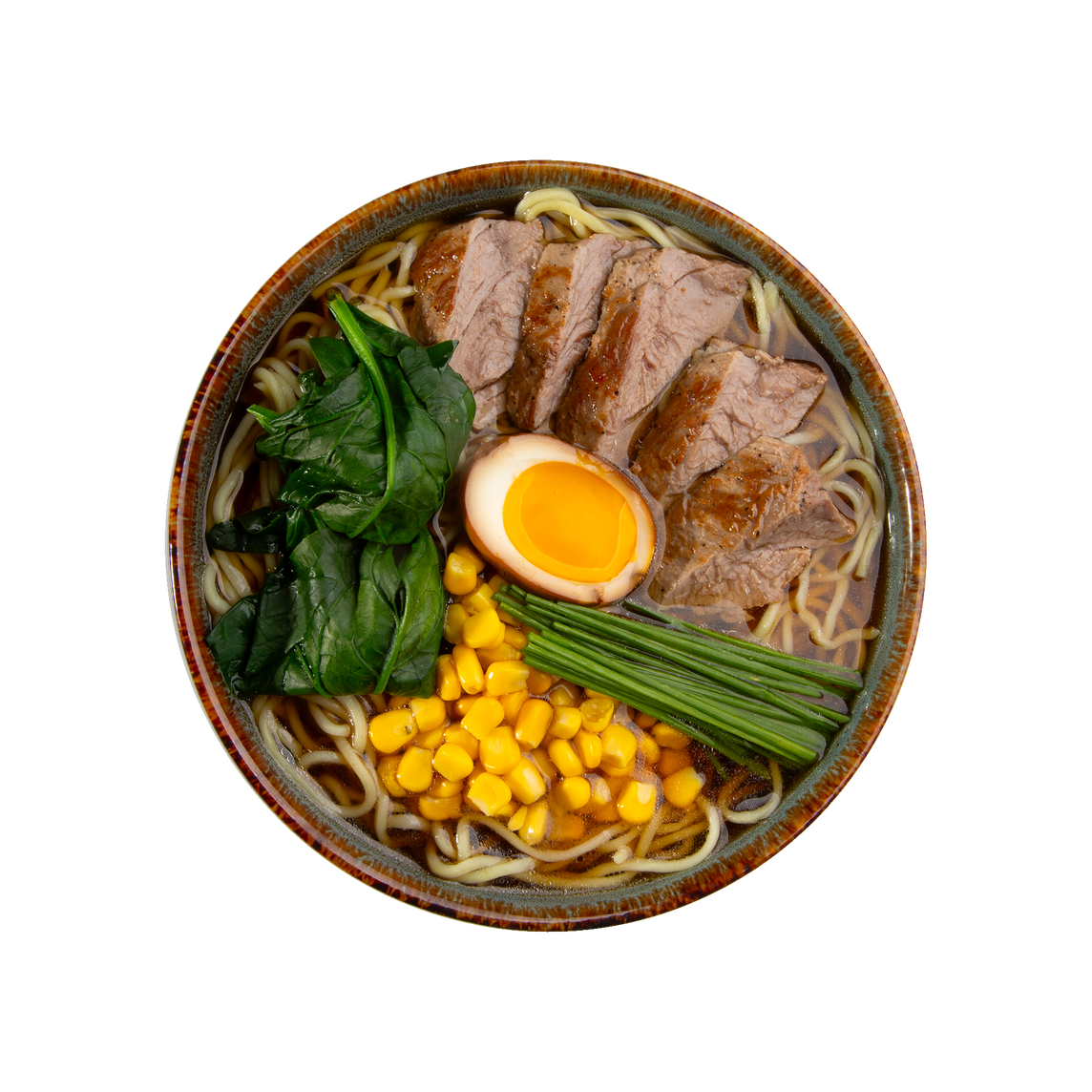 Fondo shoyu, pasta ramen, arrachera (100g), huevo marinado, espinaca, elote, cebollín, aceite de ajonjolí.