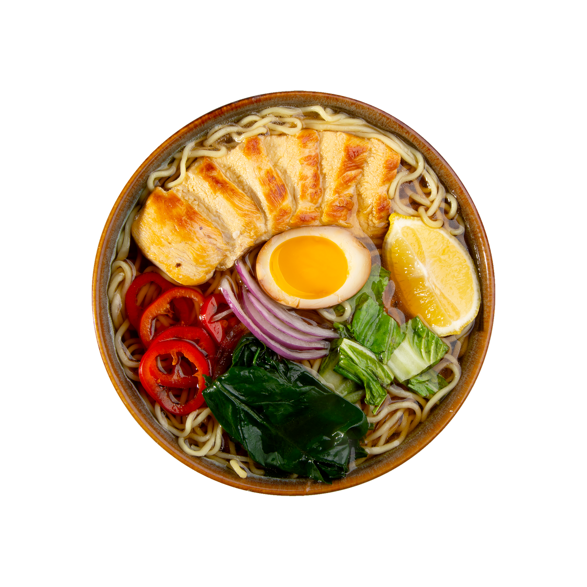 Fondo shoyu, pasta ramen, pollo (100g), huevo marinado, elote, espinaca, germen de soya, cebolla morada, chicoria, cilantro, chile rojo y limón.