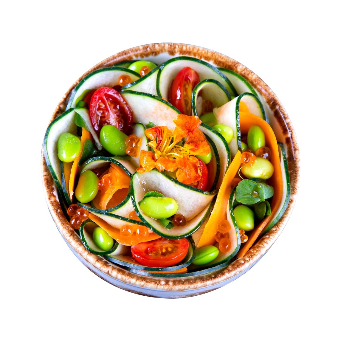 Pepino avinagrado, zanahoria, edamame, jitomate cherry, ikura, brotes de chicharo y flor comestible. (240 g)