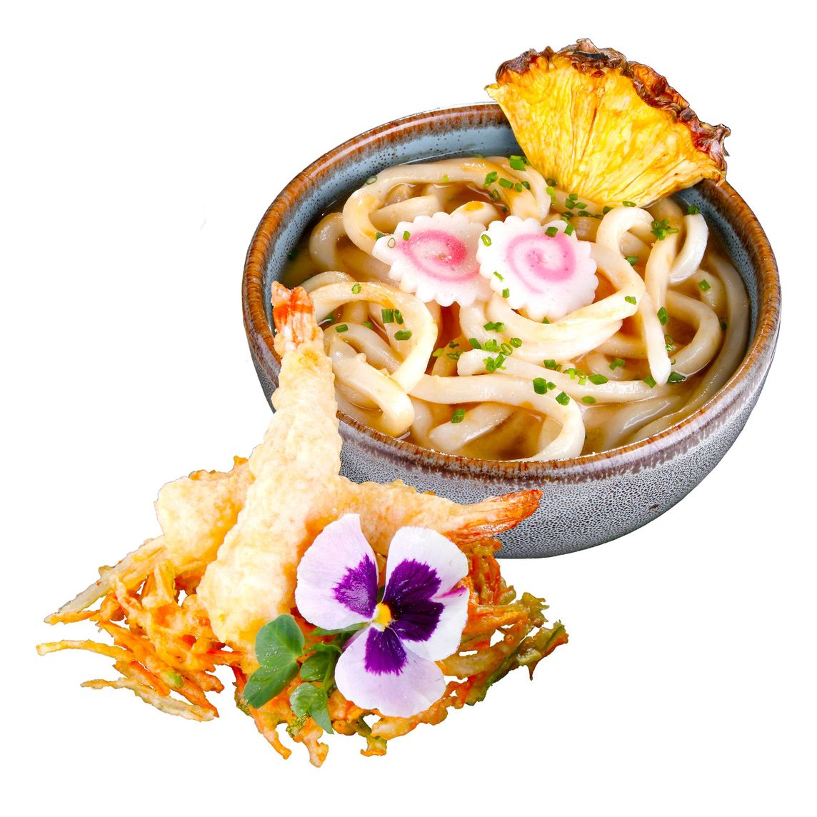 Con camarones (2 pzas.) y vegetales tempurados, brotes, naruto, cebollín, flor comestible, piña deshidratada, udon y fondo miso. (300 ml)