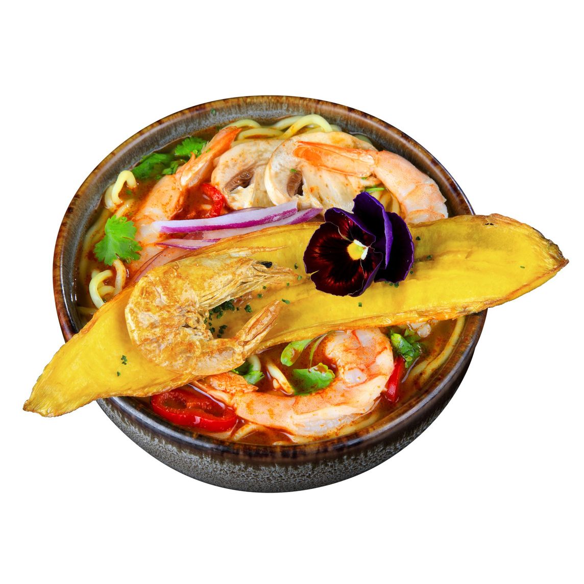 Ramen picante con camarones (3pzas.), vegetales, plátano frito y flor comestible. 300ml ¡Deliciosamente Picante!