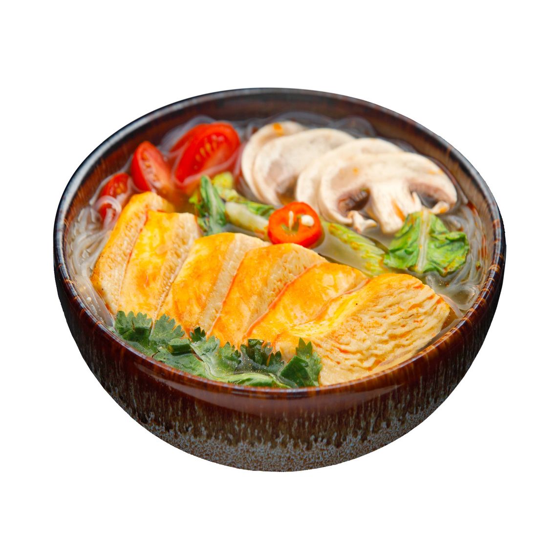Pechuga de pollo spicy (40 g), jitomates cherry, champiñon, chicoria, apio, harusame, cilantro y chile rojo. (300ml)