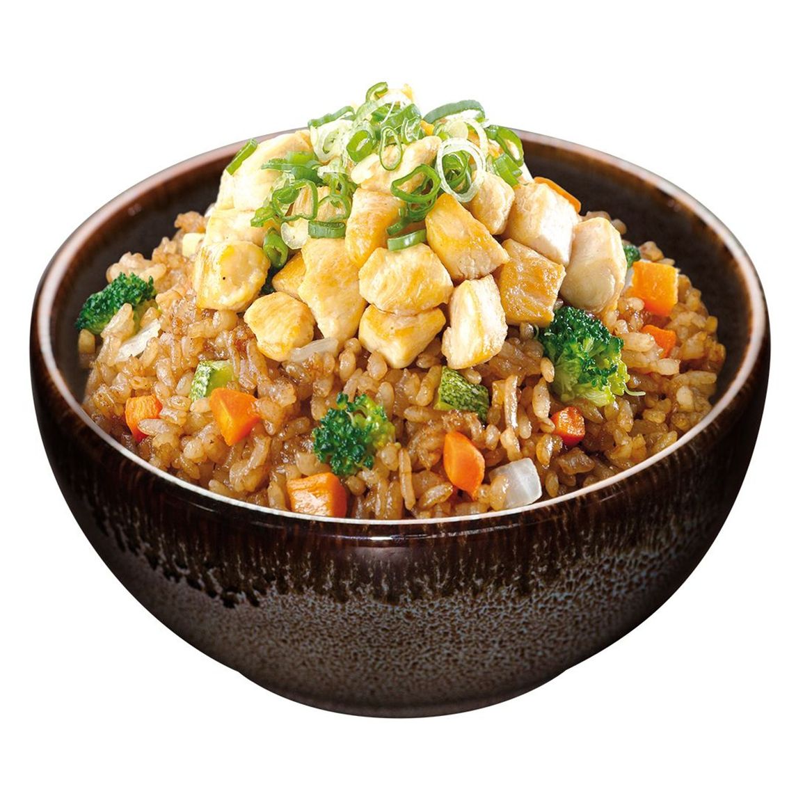 Arroz frito con verduras, huevo, pollo (50 g) y cebollín.