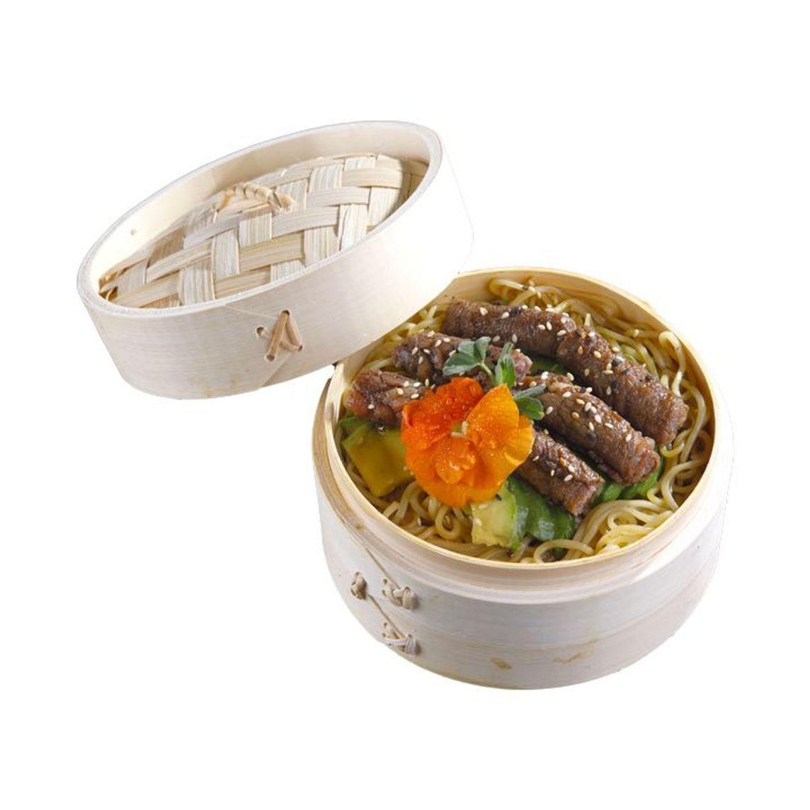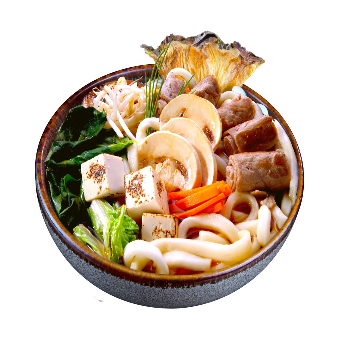 Rib eye (60g), tofu, vegetales a la plancha, udon, fondo sukiyaki y piña deshidratada. (350 ml)