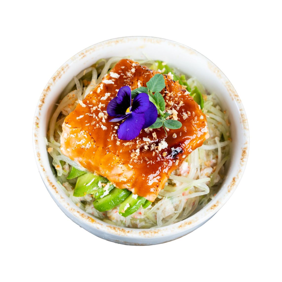 Pasta ramen con salmón teriyaki, aguacate, ajonjolí mixto y flor comestible. (60g)