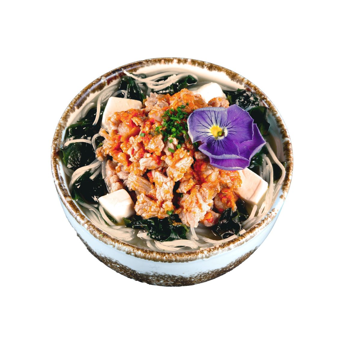Fondo miso con harusame, rib wye spicy (40g), tofu, alga, cebollín y flor comestible. (300 ml).