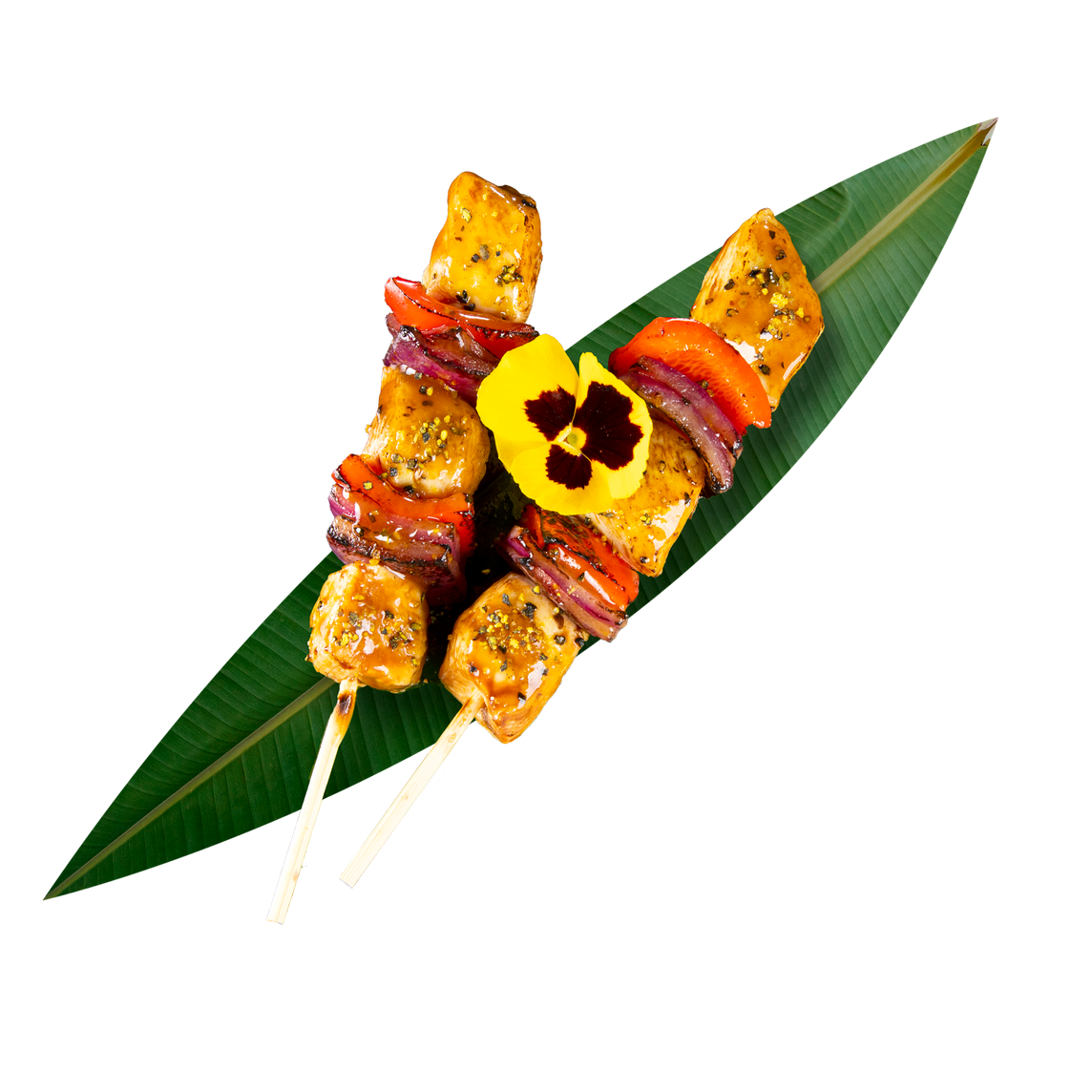 Brocheta a la parrilla con pollo (60g), pimiento rojo y cebolla morada asada con pimienta limón.