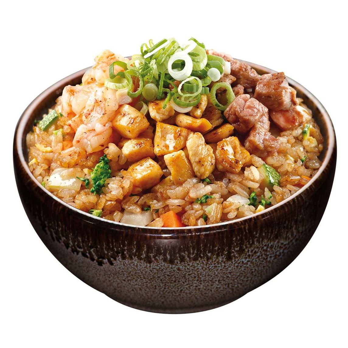 Arroz frito con verduras, huevo, pollo, rib eye, camarón y cebollín. (50 g).