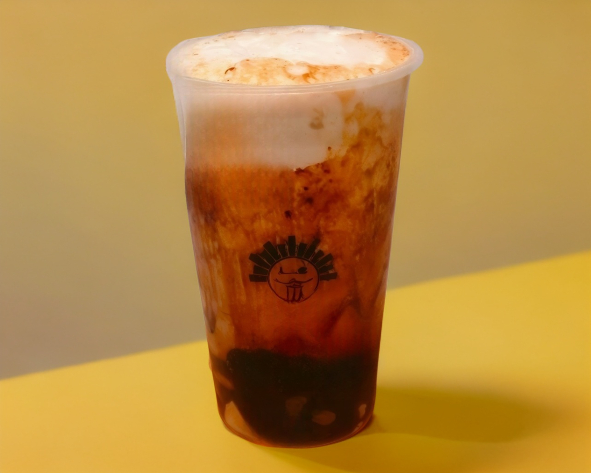 Té negro con leche, tapioca negra, tapioca blanca, azuki dulce y tapioca explosiva, 500 ml.