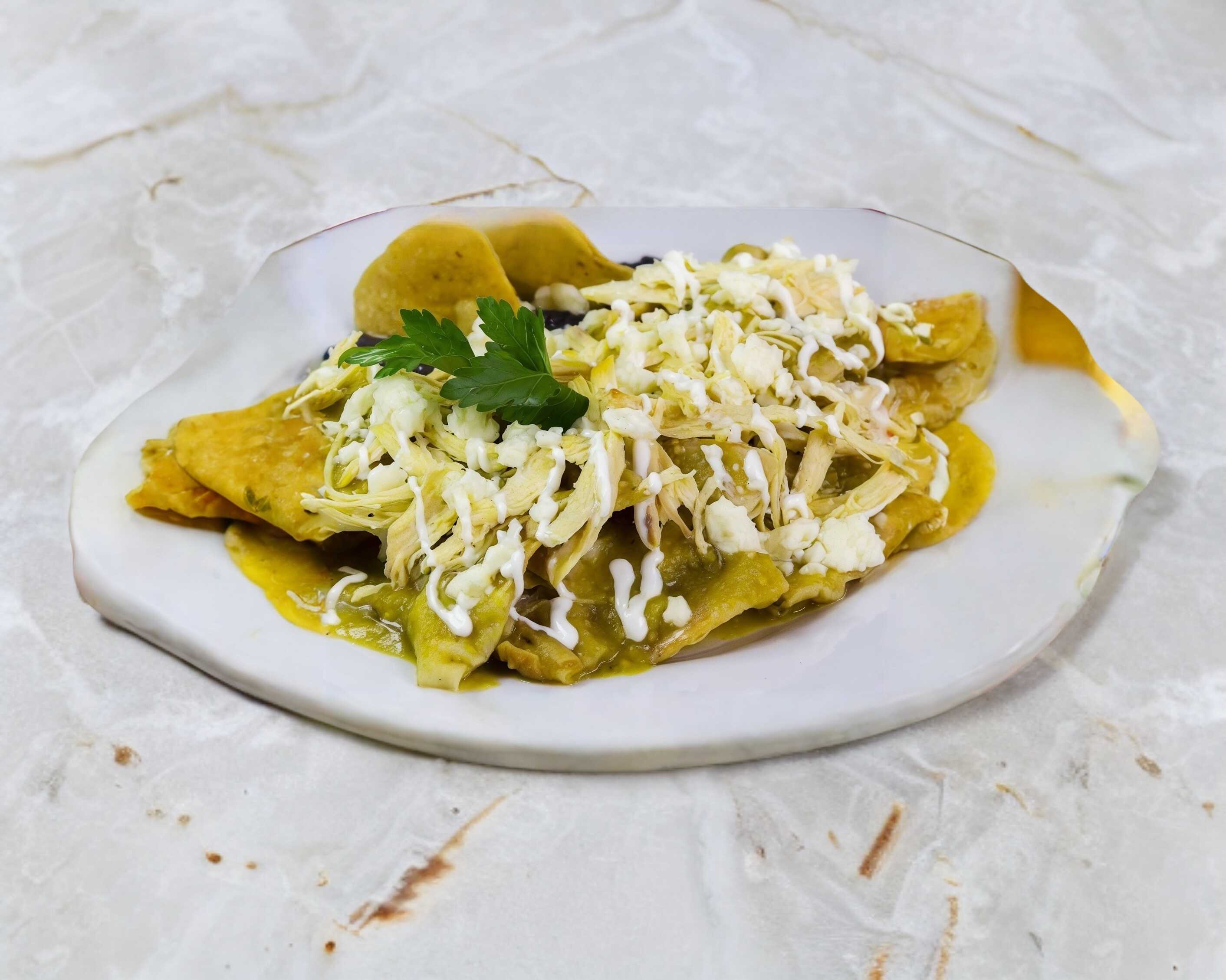 Ricos chilaquiles bañados en salsa verde , acompañados de pollo, queso, crema y su respectiva cebolla.