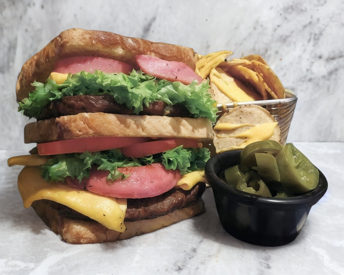 Queso oaxaca gratinado acompañada de pollo a la plancha y camarones a la mantequilla