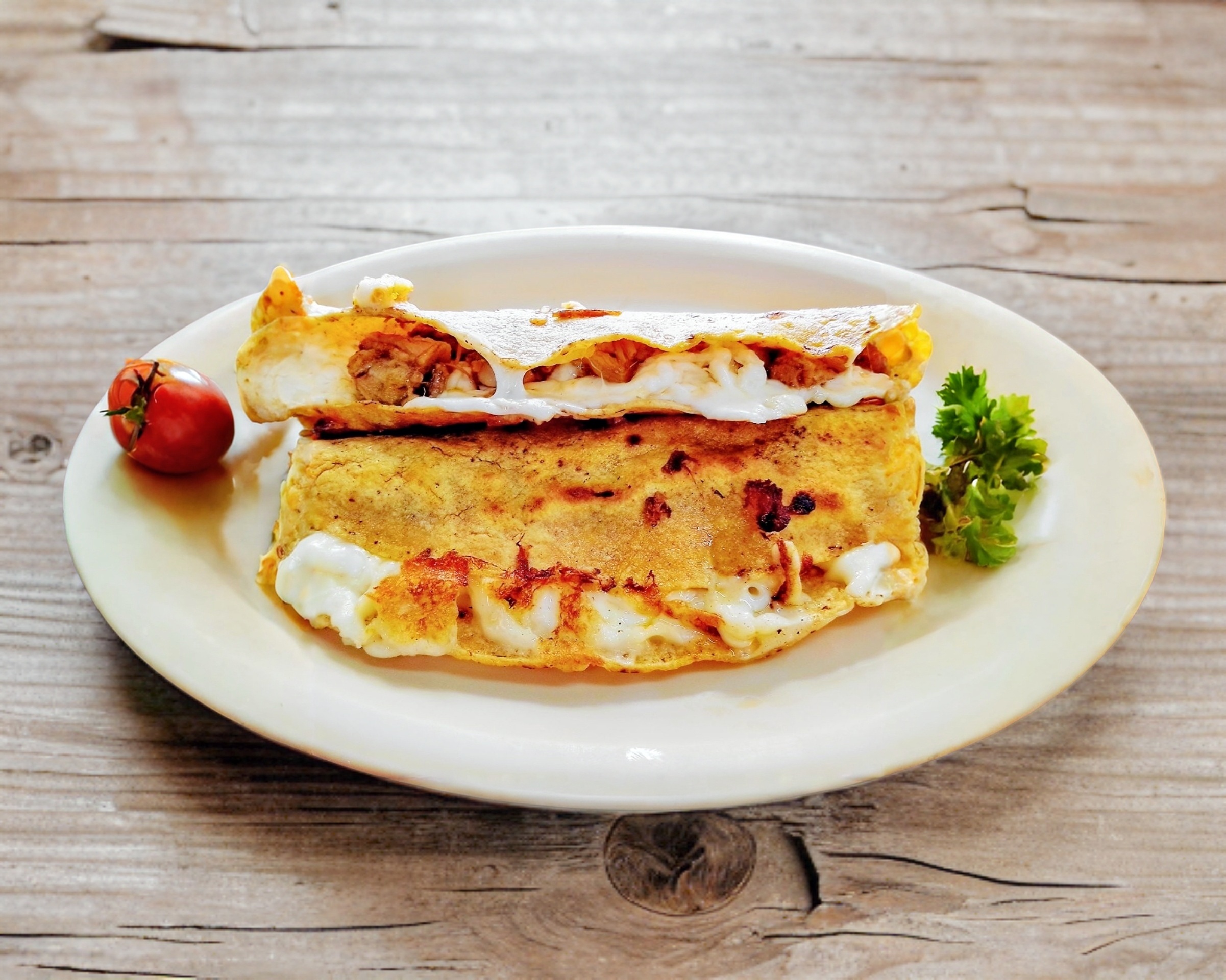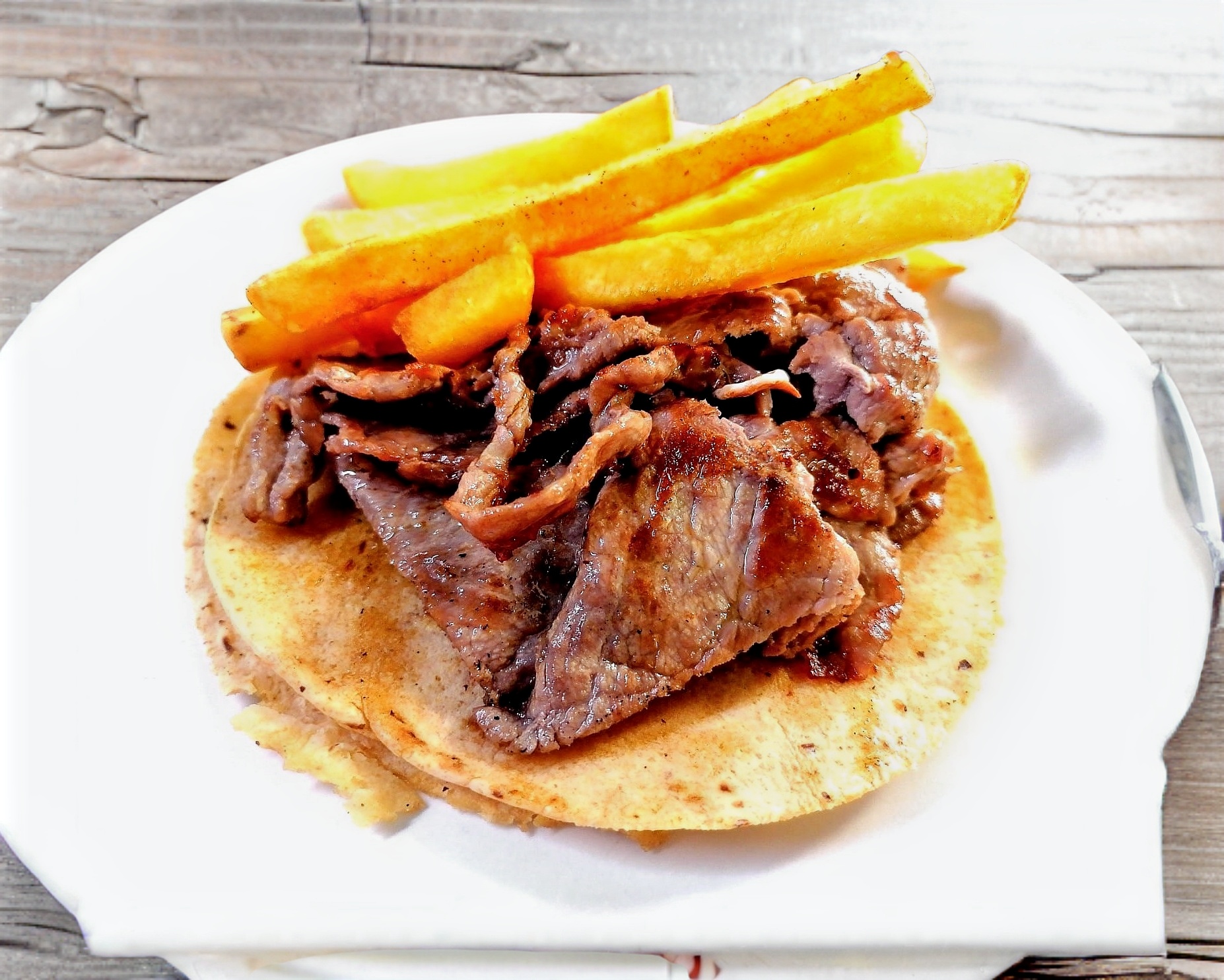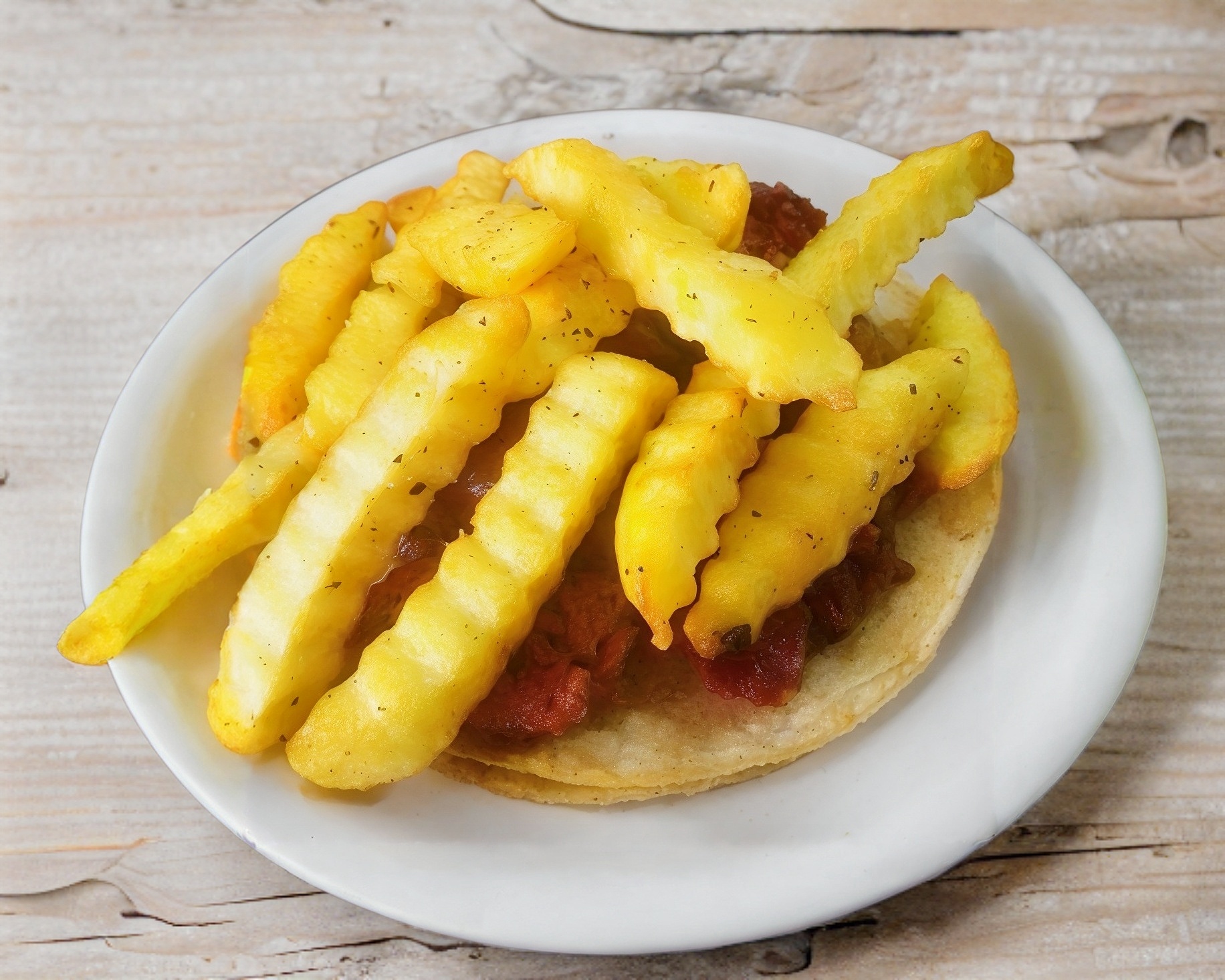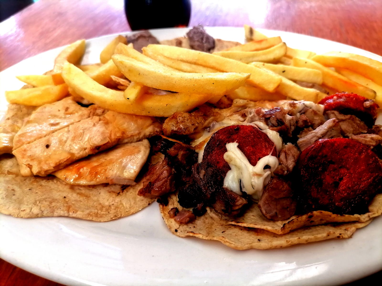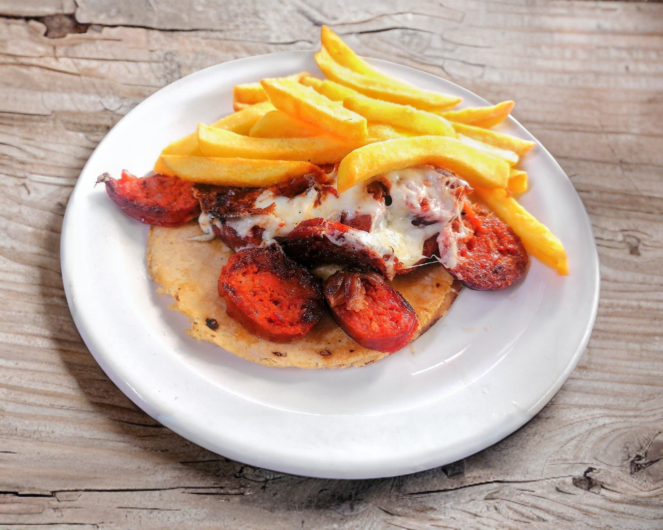 Suadero, longaniza y queso Oaxaca derretido en una rica tortilla de maíz, acompañada de ricas papas.