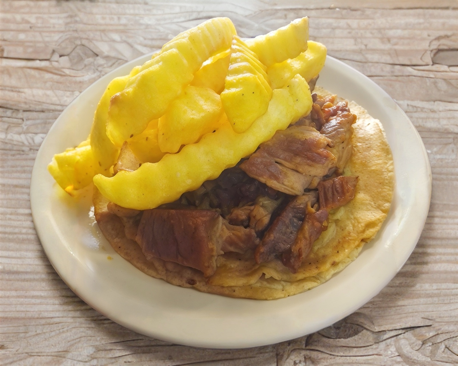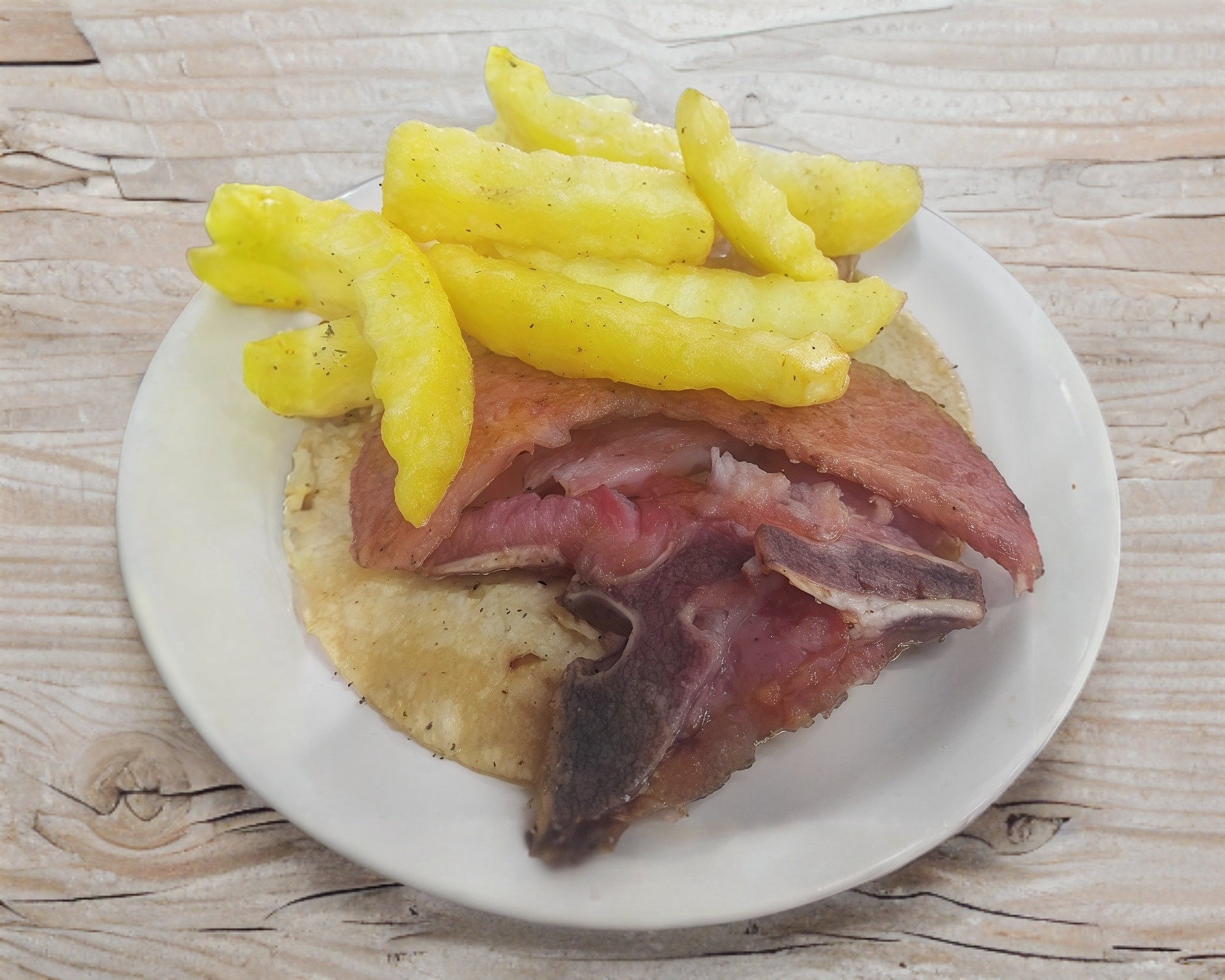 Chuleta ahumada en tortilla de maíz con ricas papas.