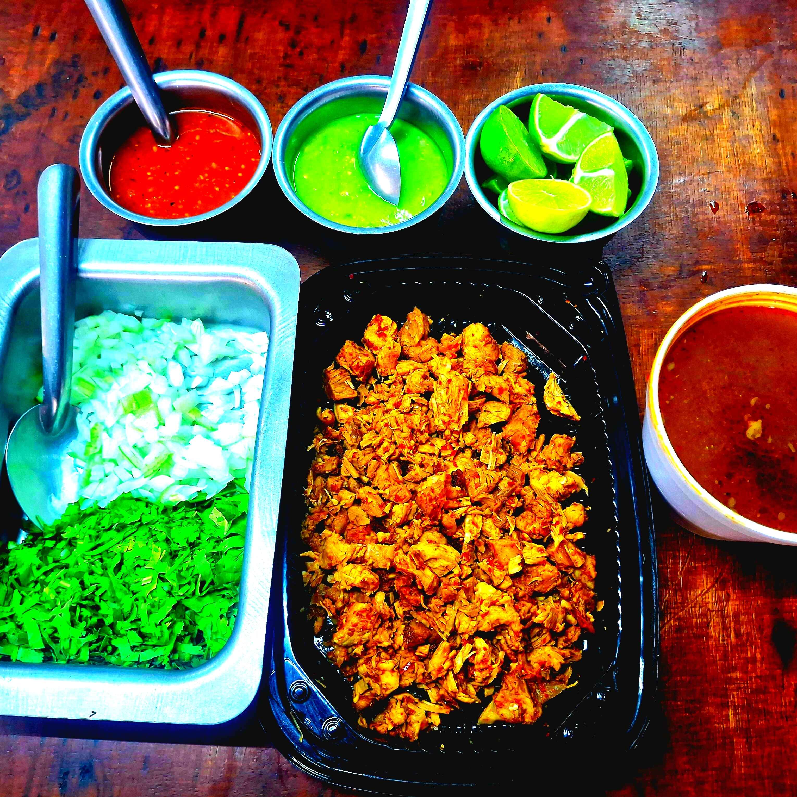 500 gramos de exquisita birria maciza y 500 de autentica birria surtida, acompañada por salsa roja, salsa verde limones y rica cebolla y cilantro.