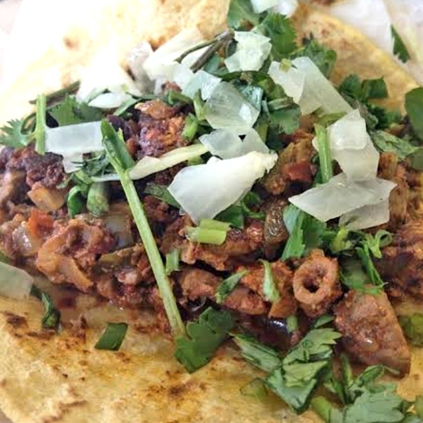 Una rica porción de longaniza y suadero en tortilla de maíz con ricas papas.