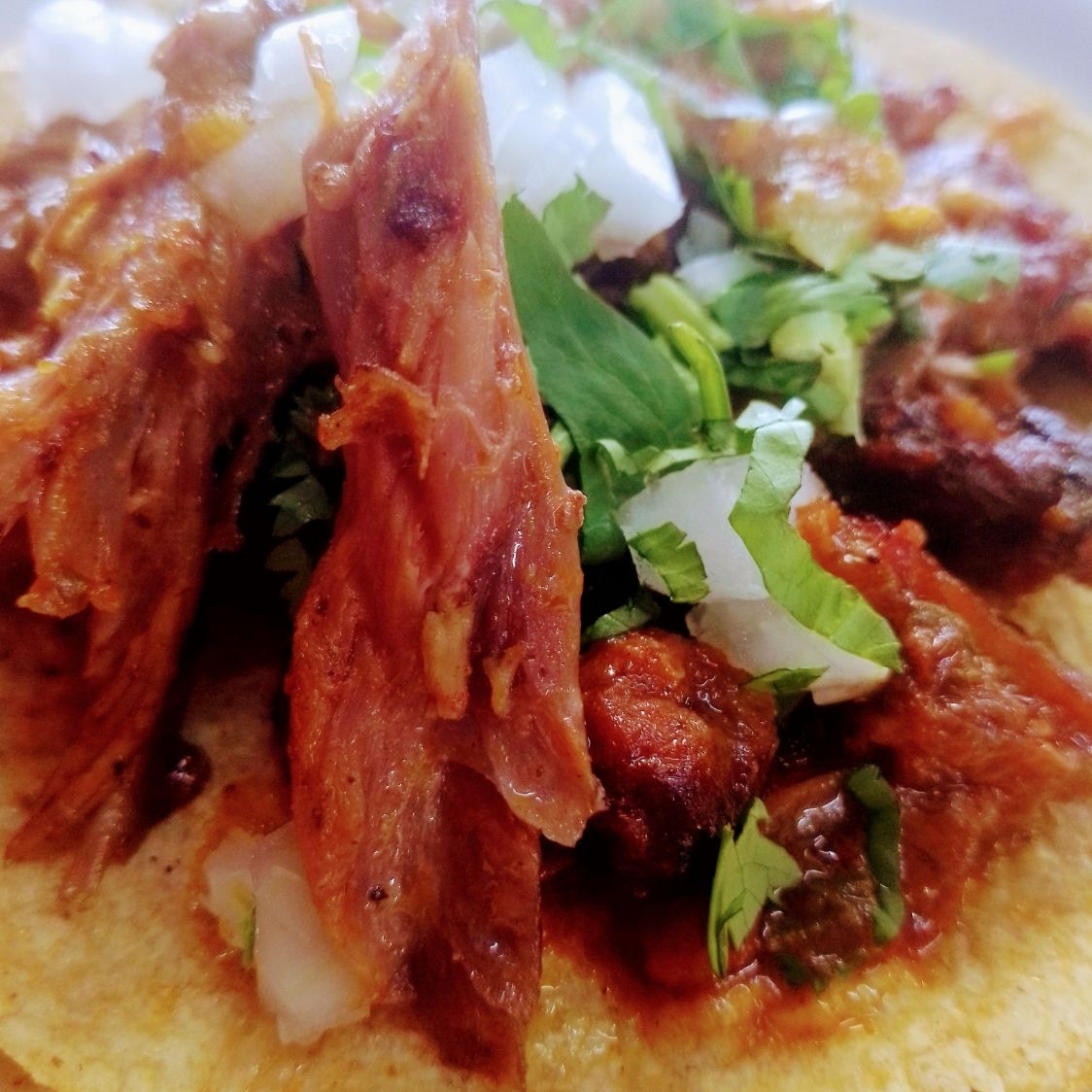Rico taco de surtida de cabeza de res en tortilla al vapor.