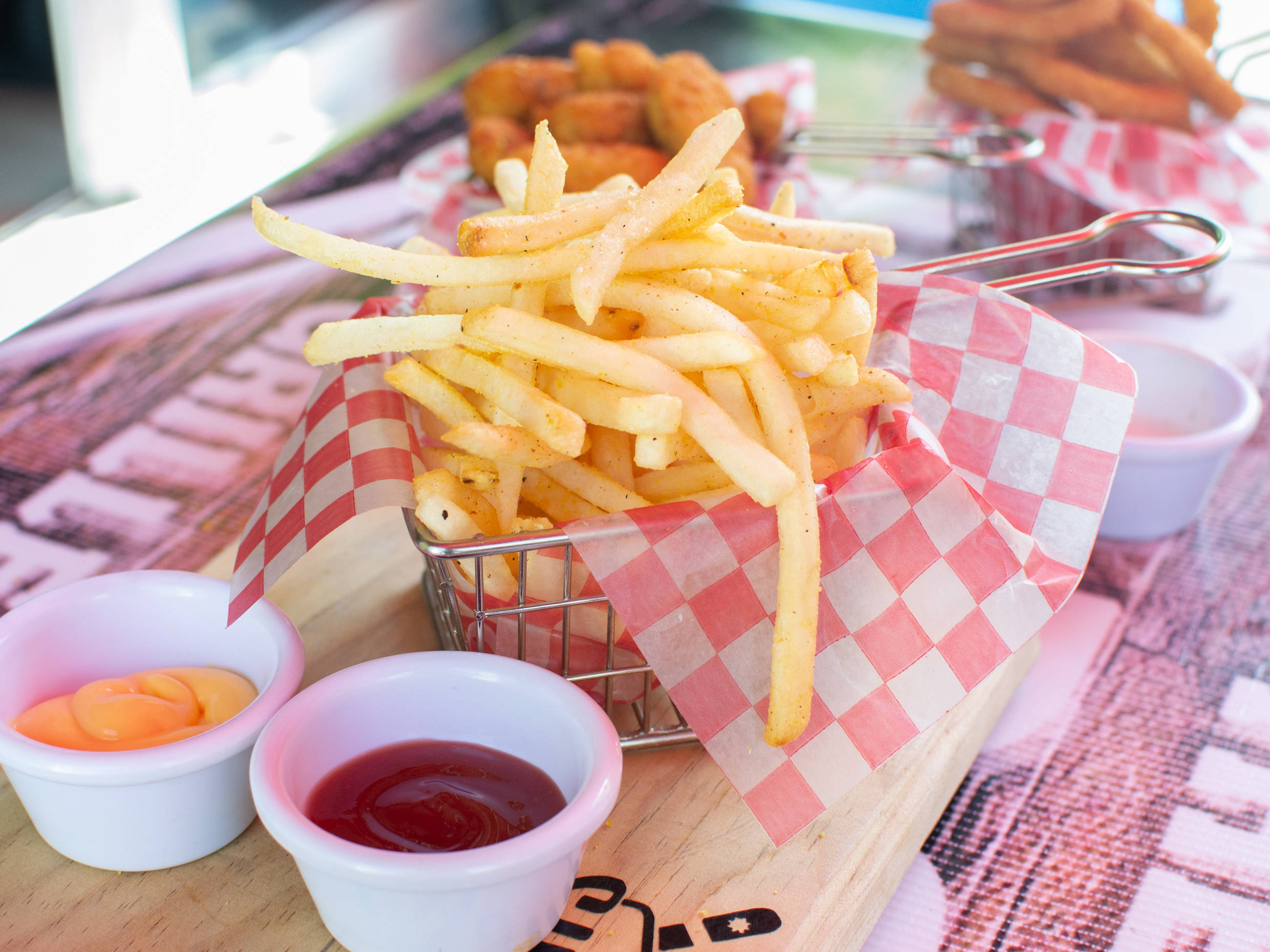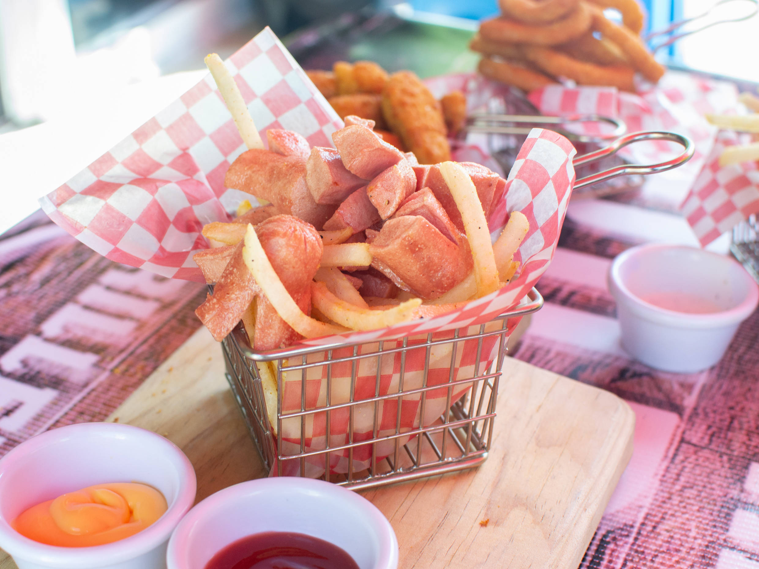 Orden de 2 piezas con queso oaxaca, tocino, piña y papas a la francesa.
