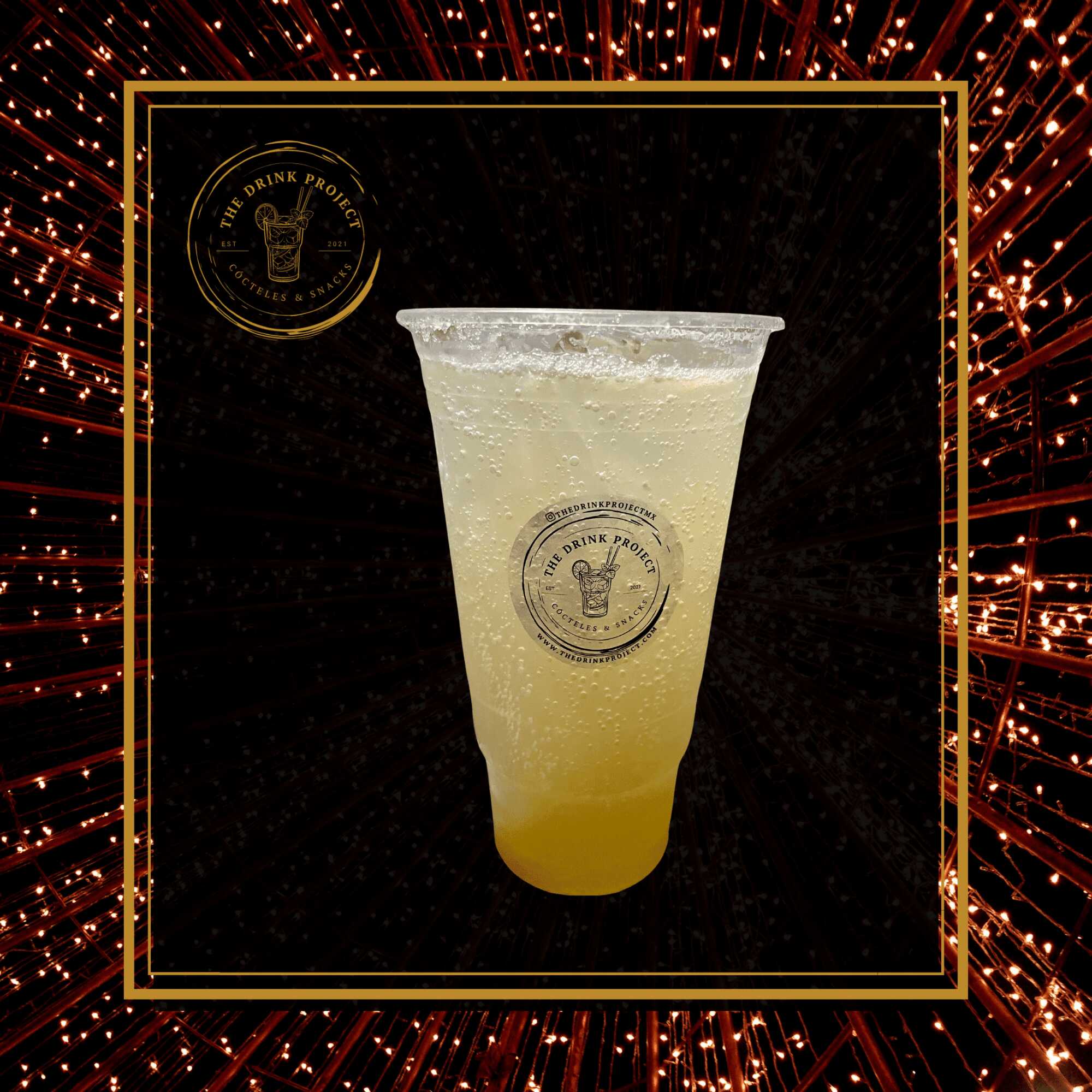1 latón de 473ml, jugo de limón, jarabe de mango y hielo.