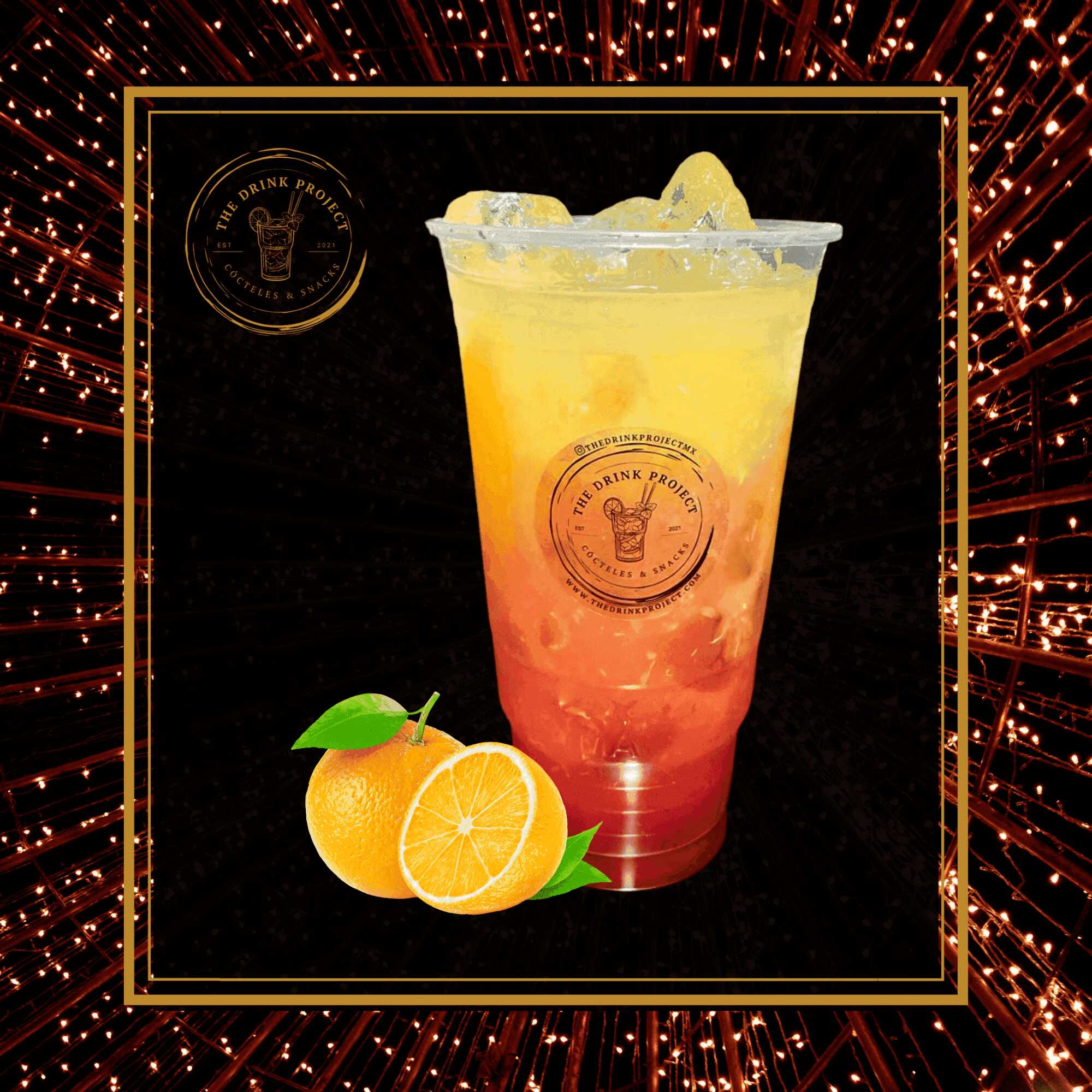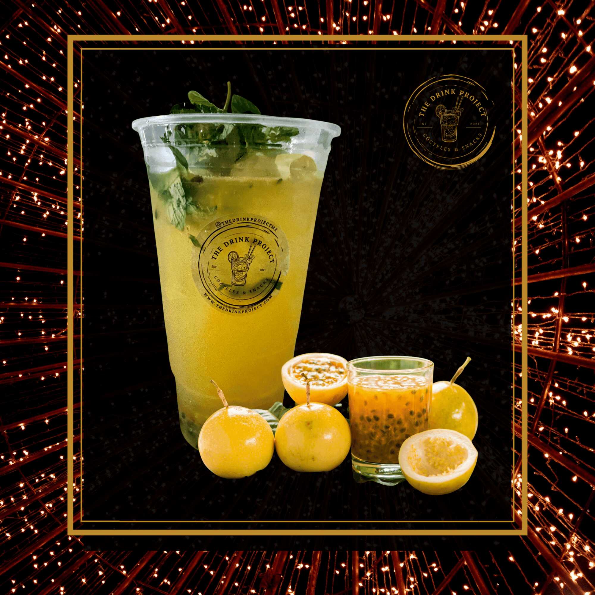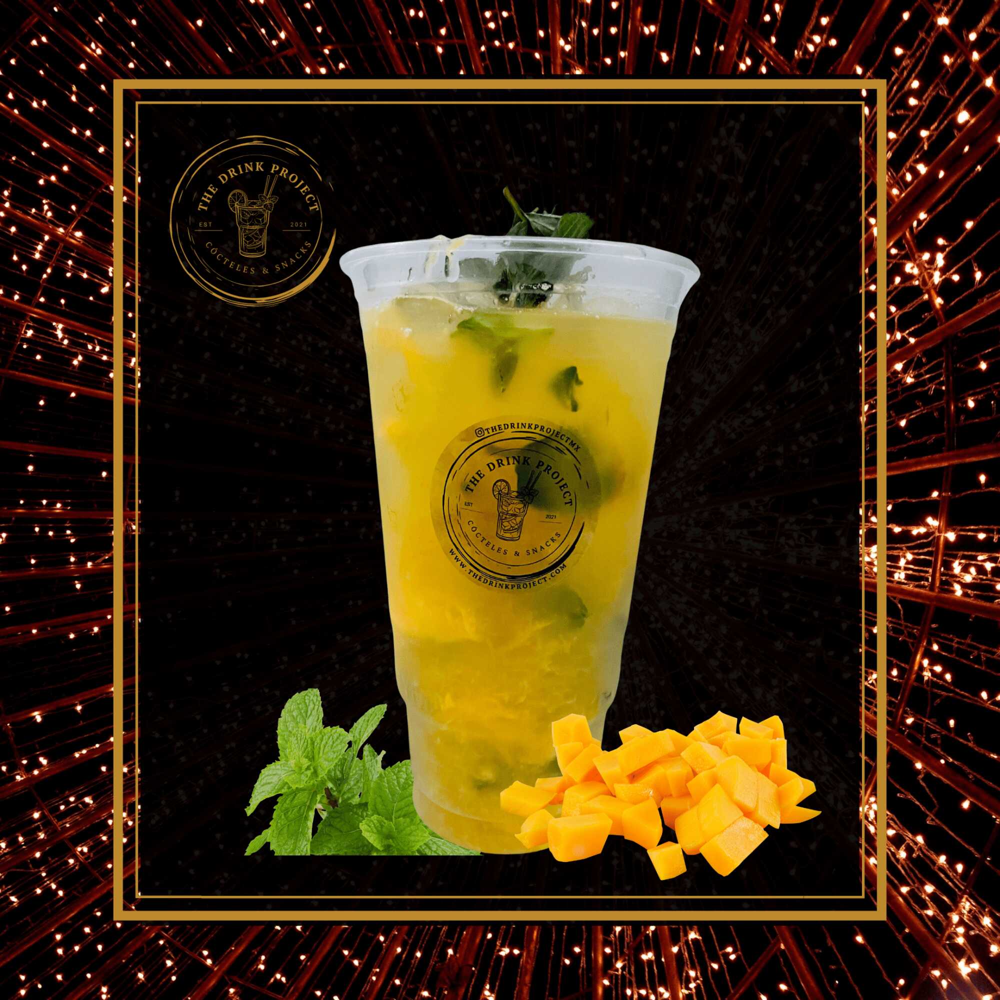 Mojito de mango, maracuyá, hierbabuena, agua mineral y hielo. Bebida de 32 oz