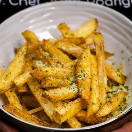 250 grs. crujientes papas, queso parmesano, sazonadas con orégano, romero y albahaca. (Cátsup y salsas se envían aparte)