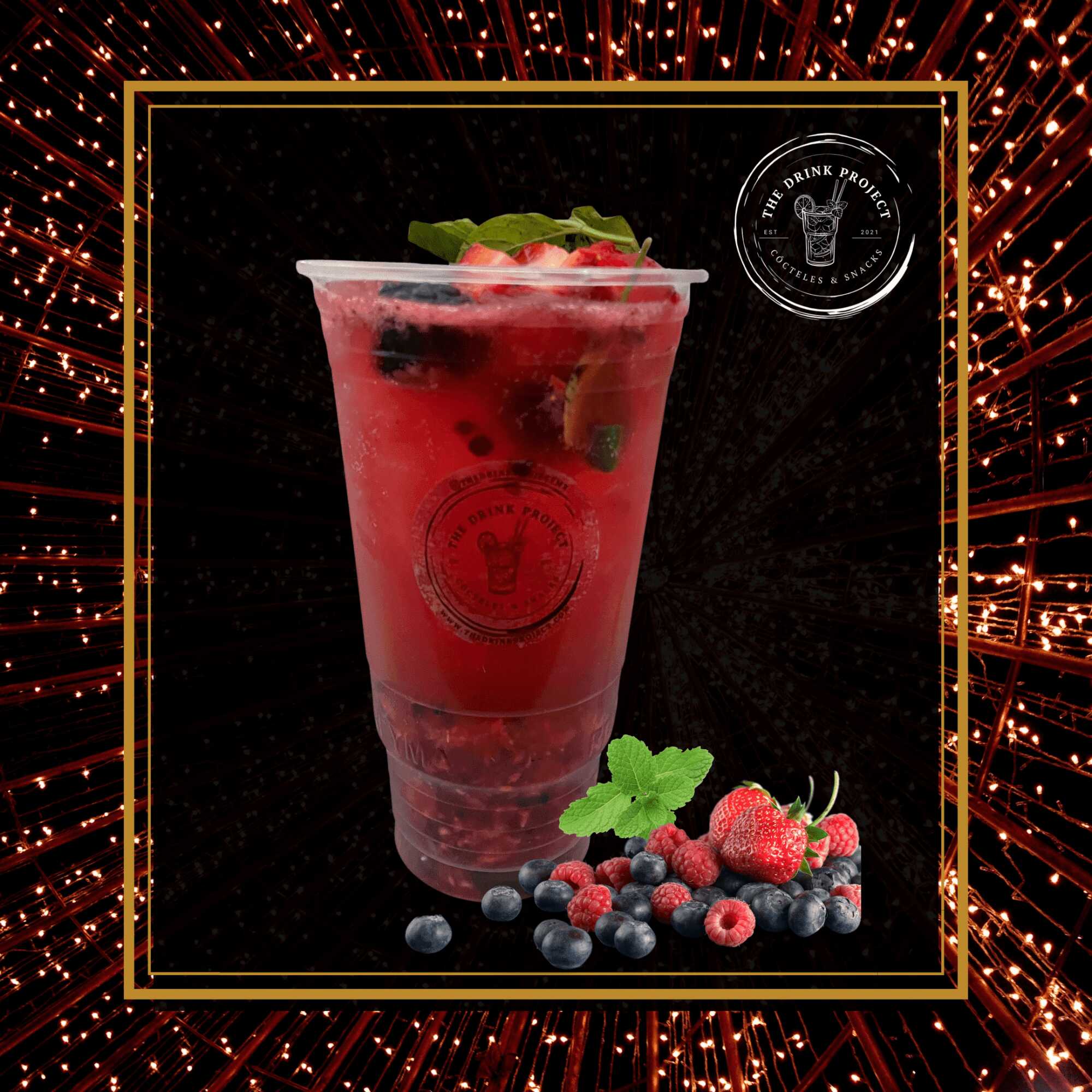 Mojito de frutos rojos con hierbabuena, agua mineral y hielo.
