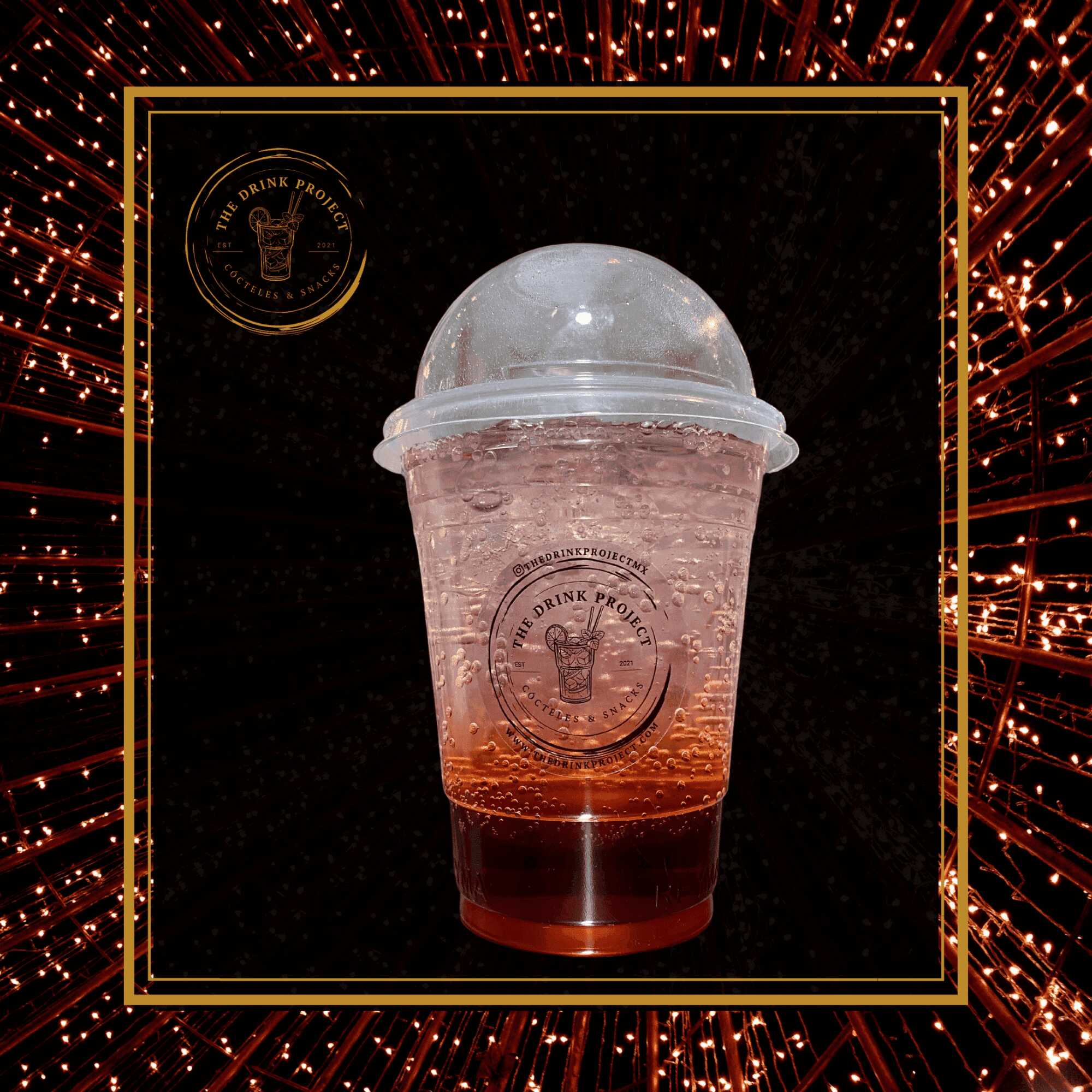 Sirope de durazno, agua mineral y hielo. Bebida de 16 oz