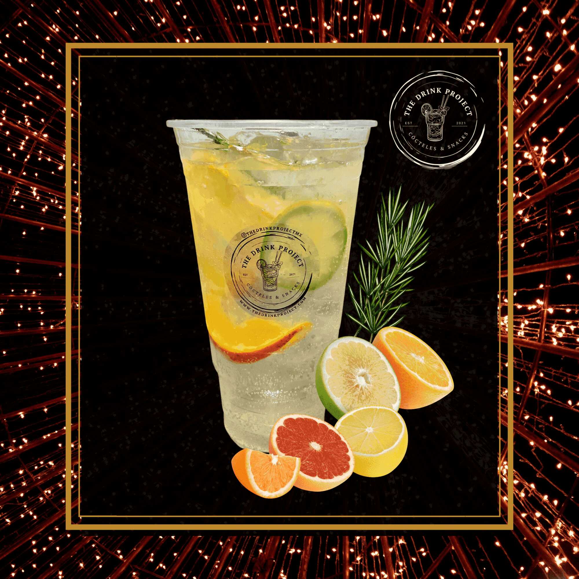 Gin, agua tónica, toronja, naranja, limón, romero, especias y hielo.