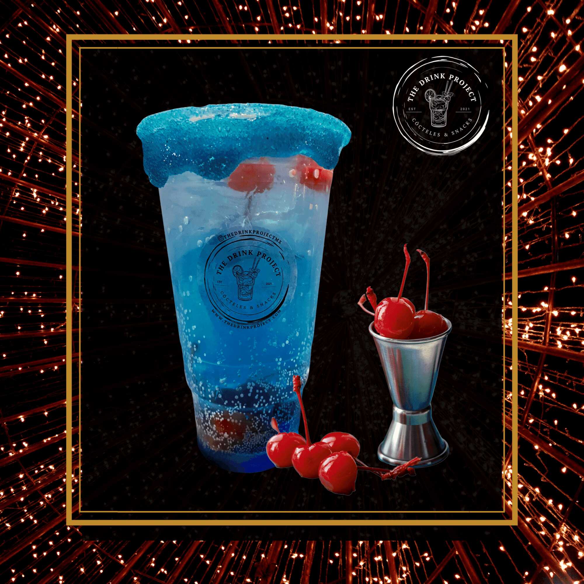 Vodka, curacao, boost, refresco de limón y cerezas.