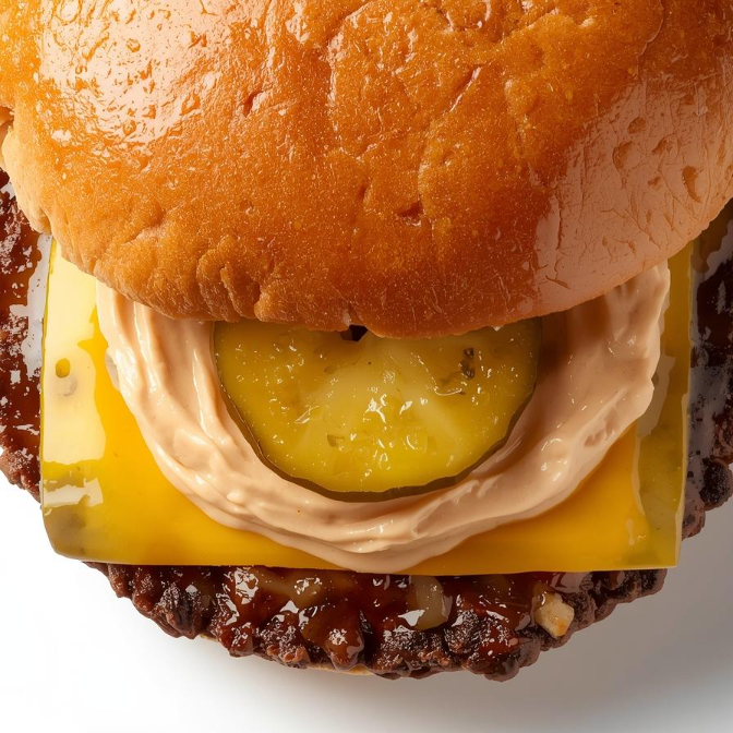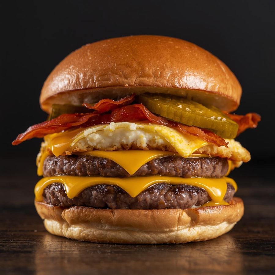 Hamburguesa triple pan (bollo artesanal), doble carne, salsa secreta, pepinillos, queso, tocino.