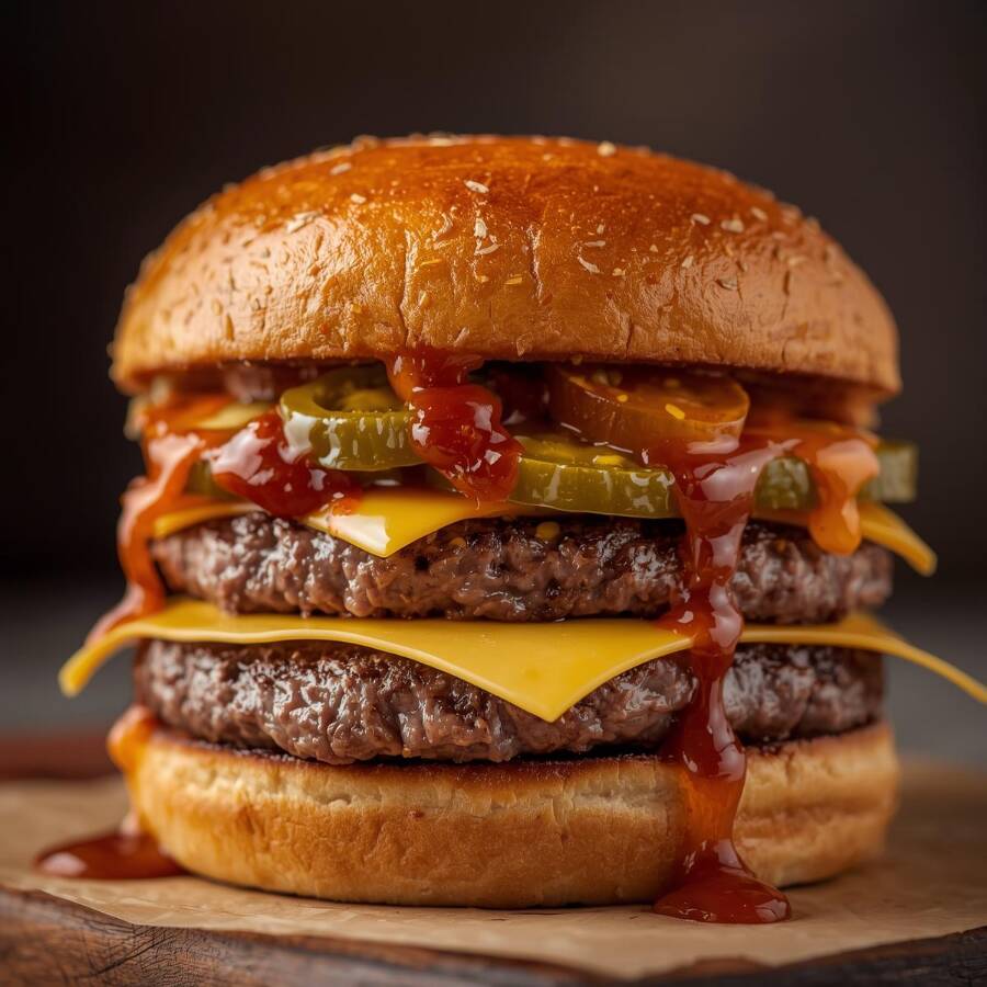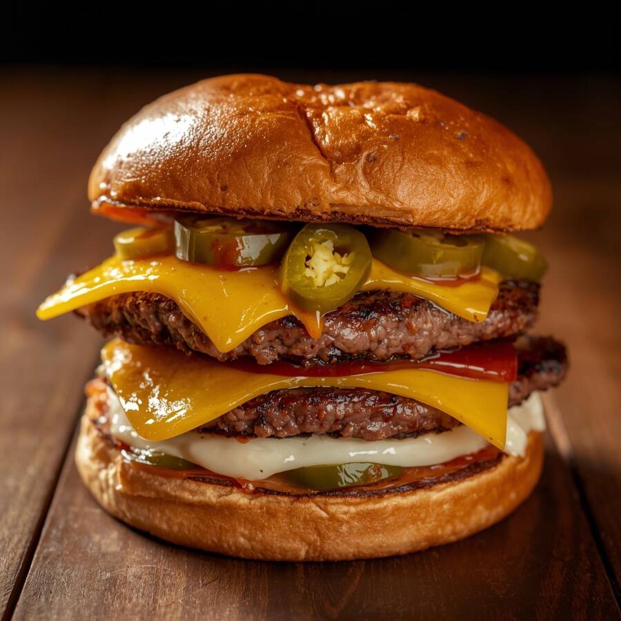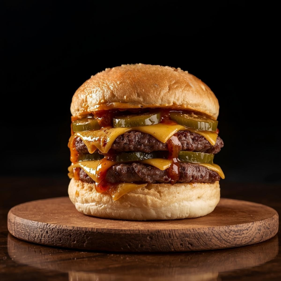 Hamburguesa triple pan (bollo artesanal), doble carne, salsa secreta, pepinillos, rajas, mezcla de quesos.