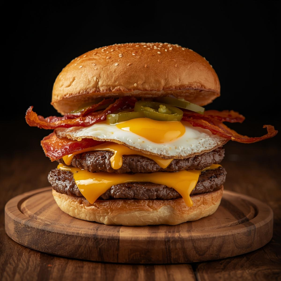 Hamburguesa triple pan (bollo artesanal), 2ble carne de 90gr, queso, 2ble tocino, huevo estrellado, salsa secreta rajas y pepinillos