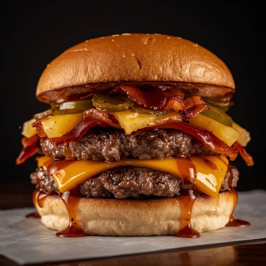 Hamburguesa triple pan (bollo artesanal), doble carne, salsa secreta, pepinillos, jitomate, queso, jamon, piña.