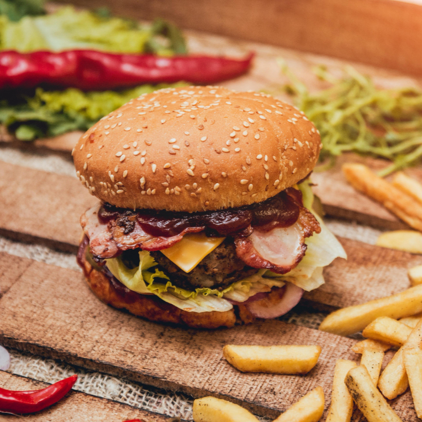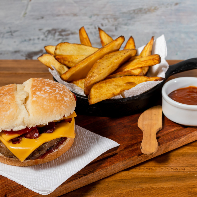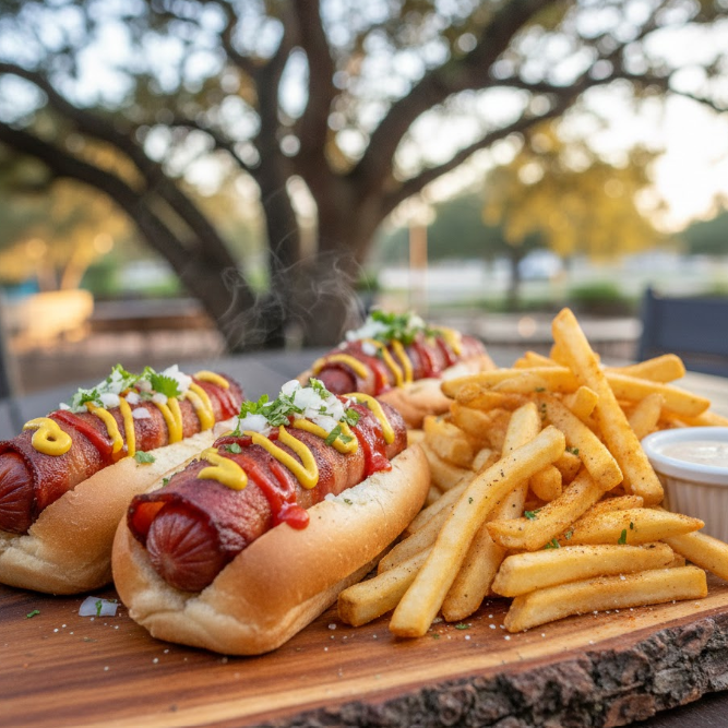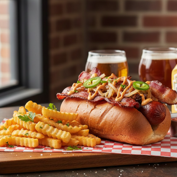 Carne, tocino, queso mozzarella y cheddar salchicha.