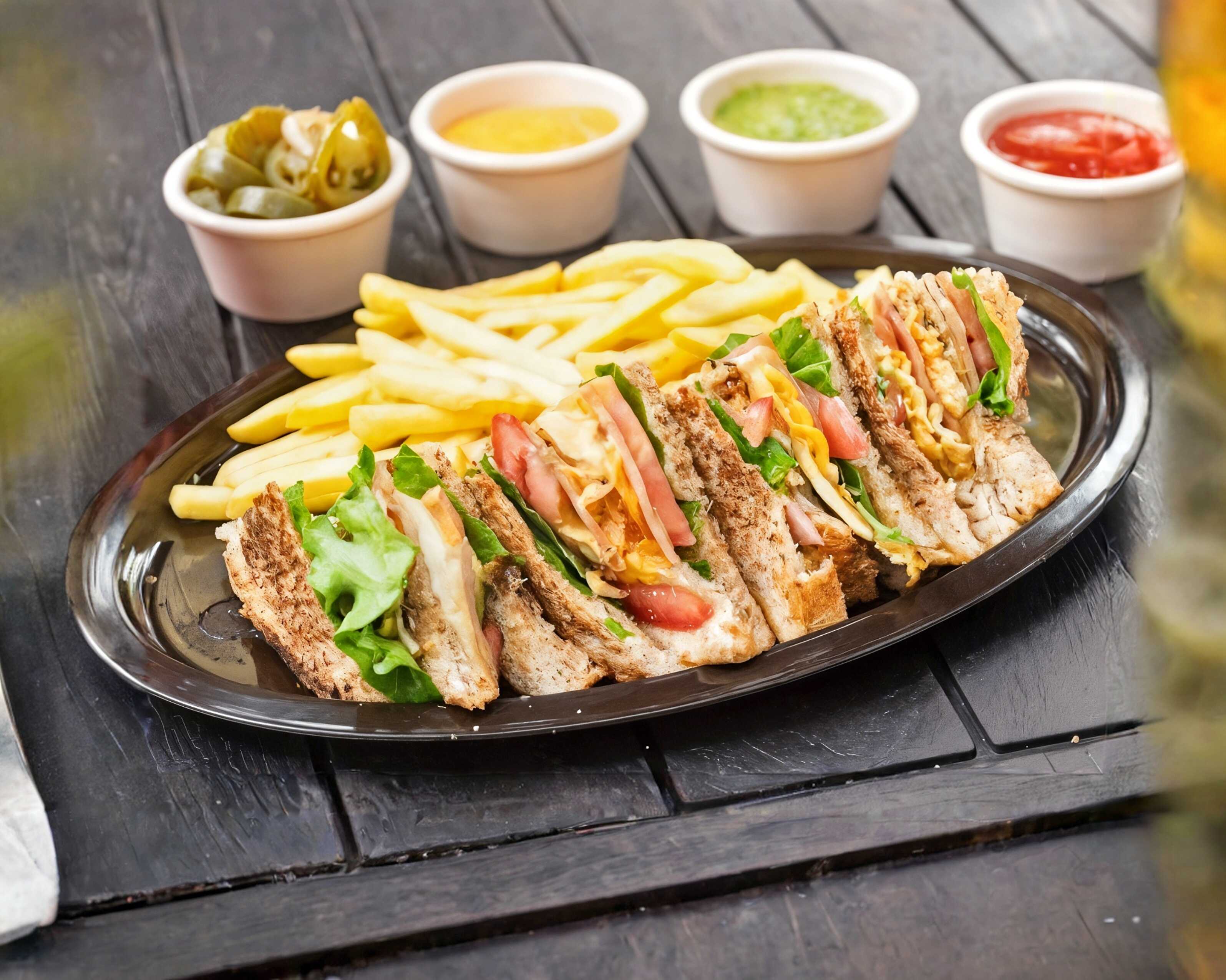 Platillo personal, 3 pisos de pan de caja, pechuga de pollo, jamón, queso amarillo, quesillo, y porción de papas a la francesa