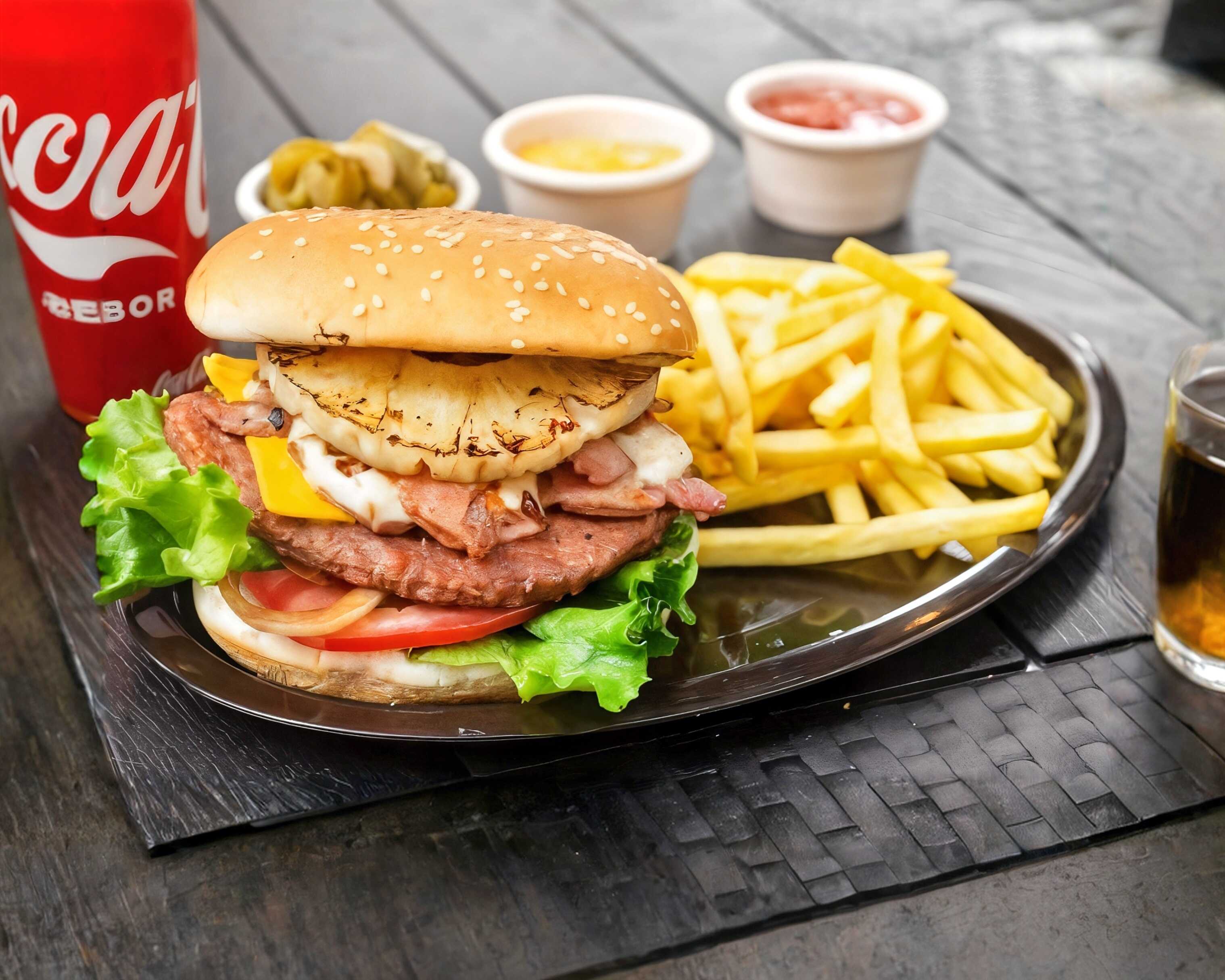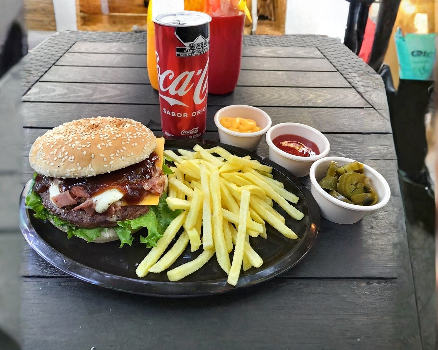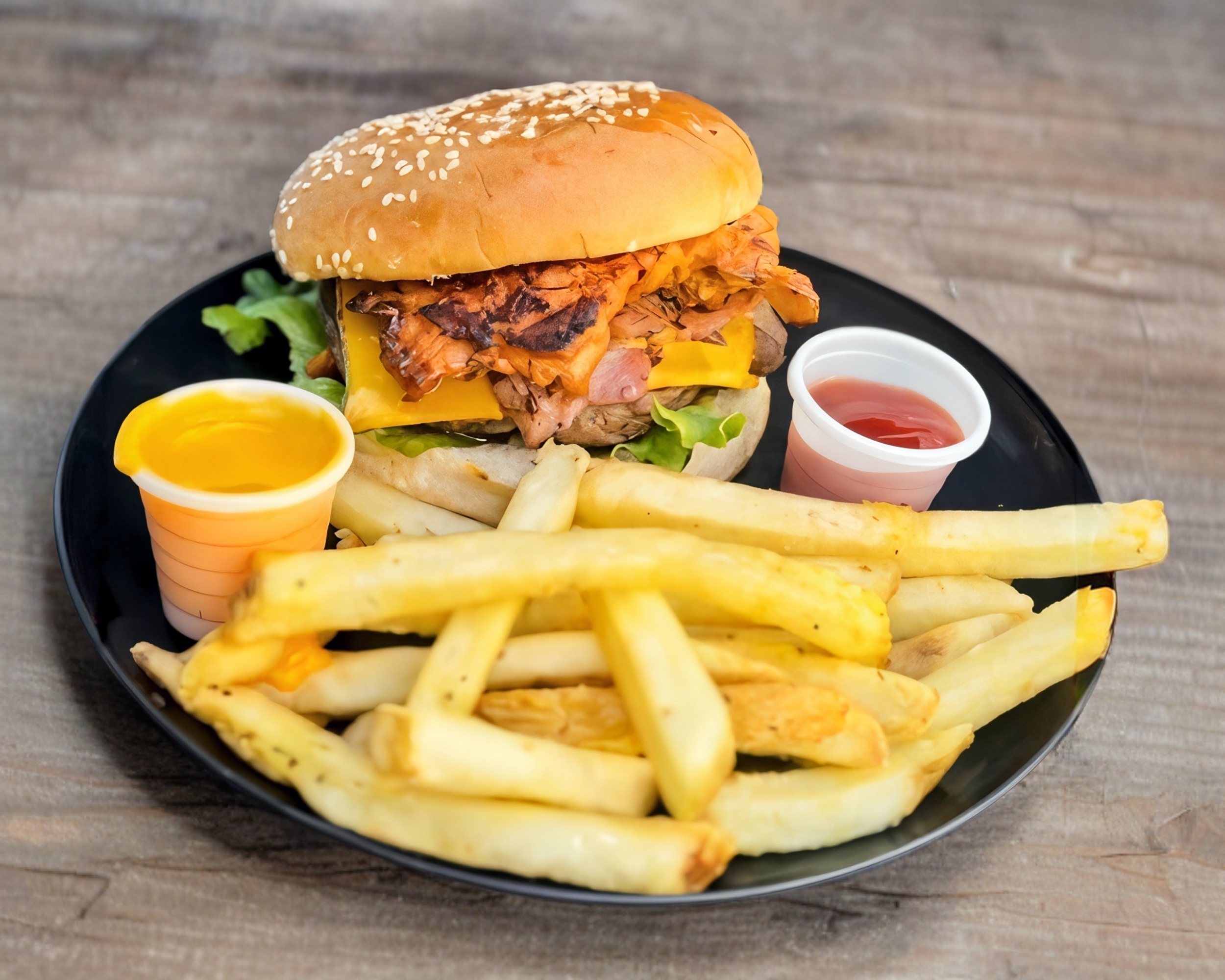 Carne de res, queso amarillo, tocino, jamón, queso fundido, salsa bbq y papas a la