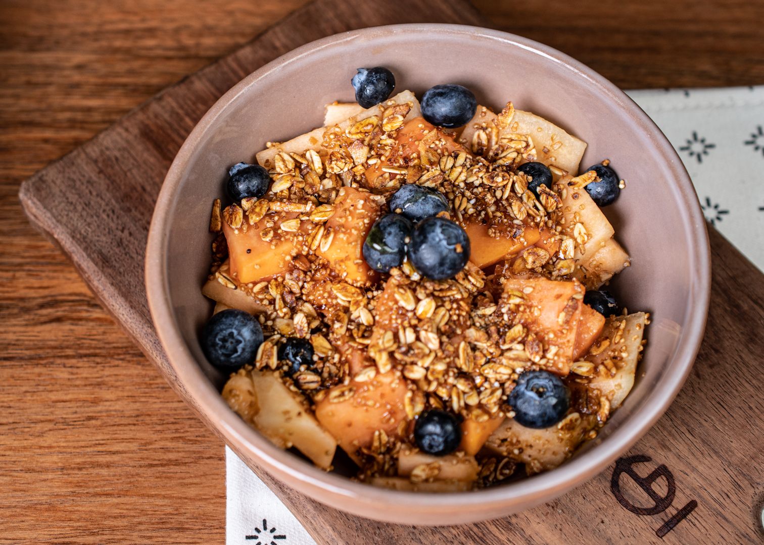 Tazón de frutas con melón, papaya, blueberry, granola y miel.