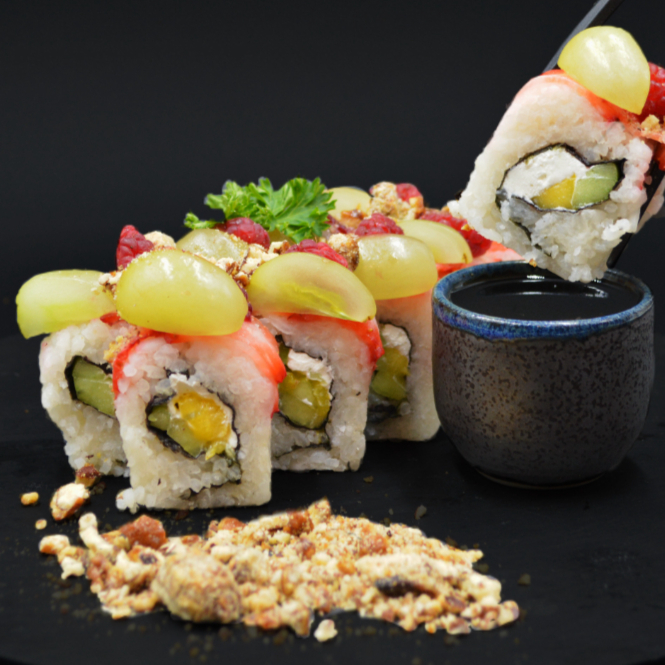 PD: Mango, queso crema y pepino. PF: Fresa, uva, frambuesa y nuez caramelizada. (10 piezas).