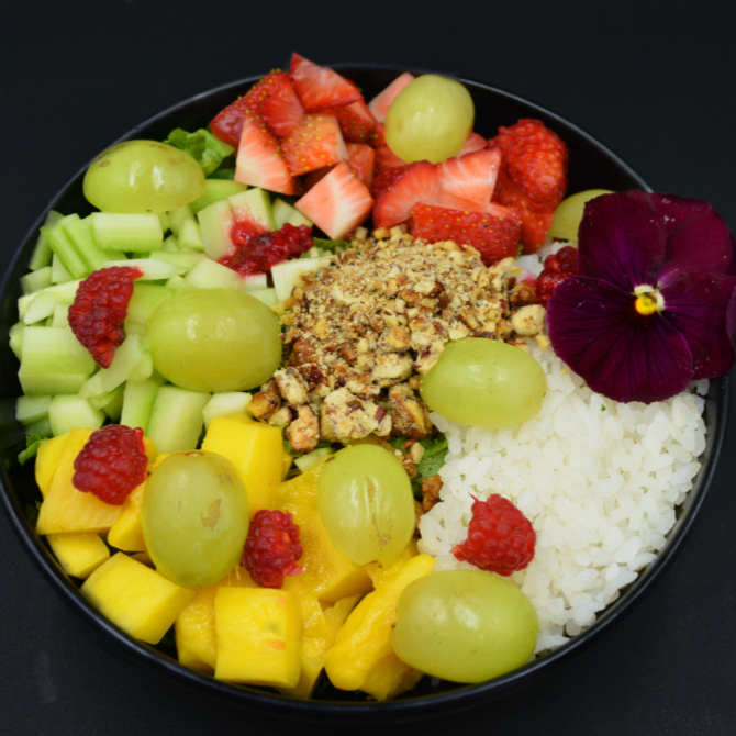 Arroz al vapor serviudo con lechuga, fresa, kiwi, mago, frambuesa, uva, pepino y nuez caramelizada