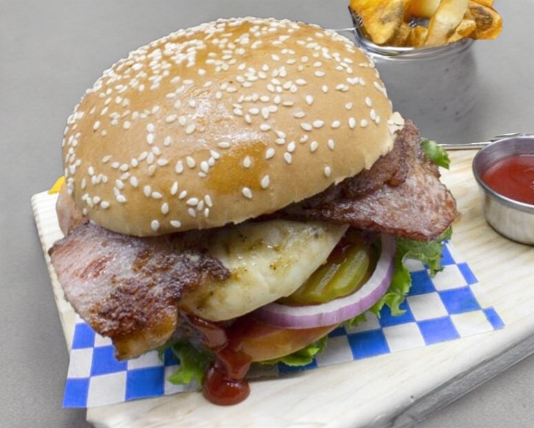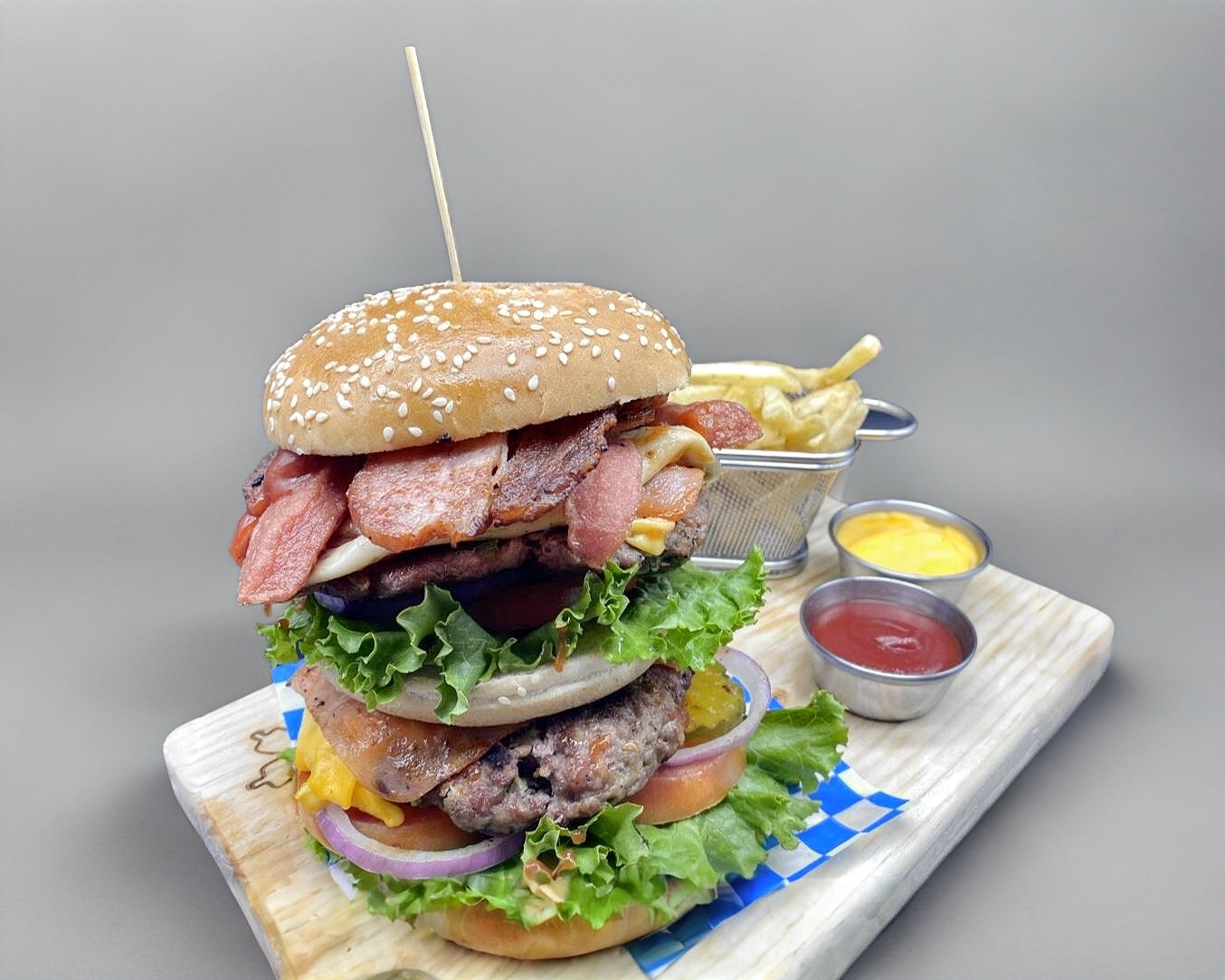 Doble carne de res (110 grs. c/u), tocino y queso americano.