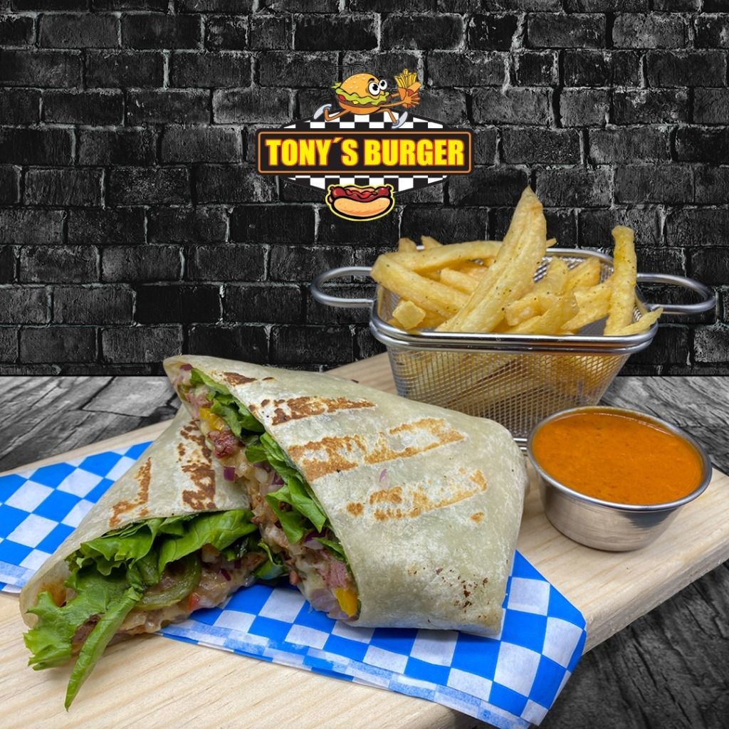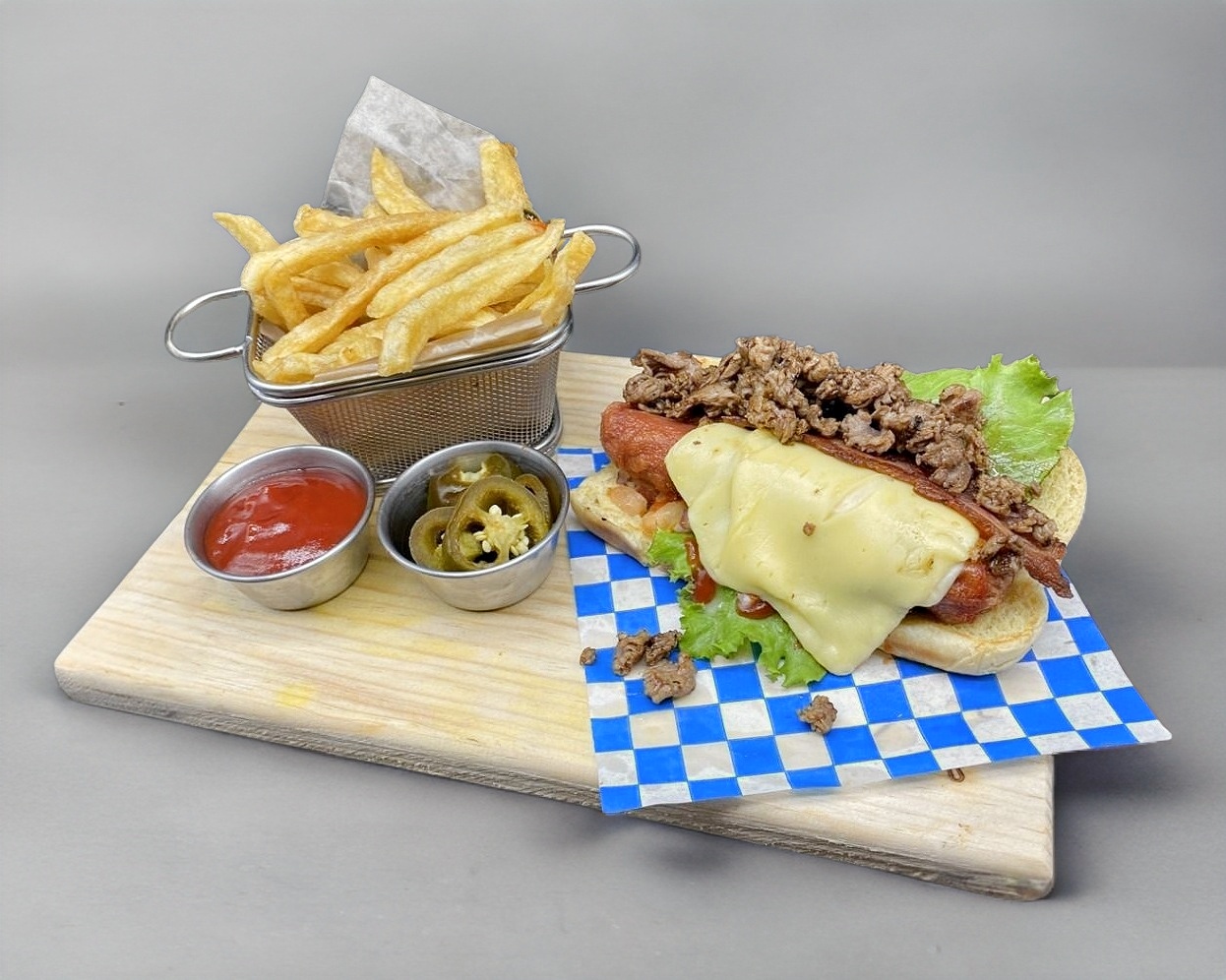 Salchicha de pavo, tocino, queso manchego, queso oaxaca,bistec, jitomate, lechuga y cebolla.