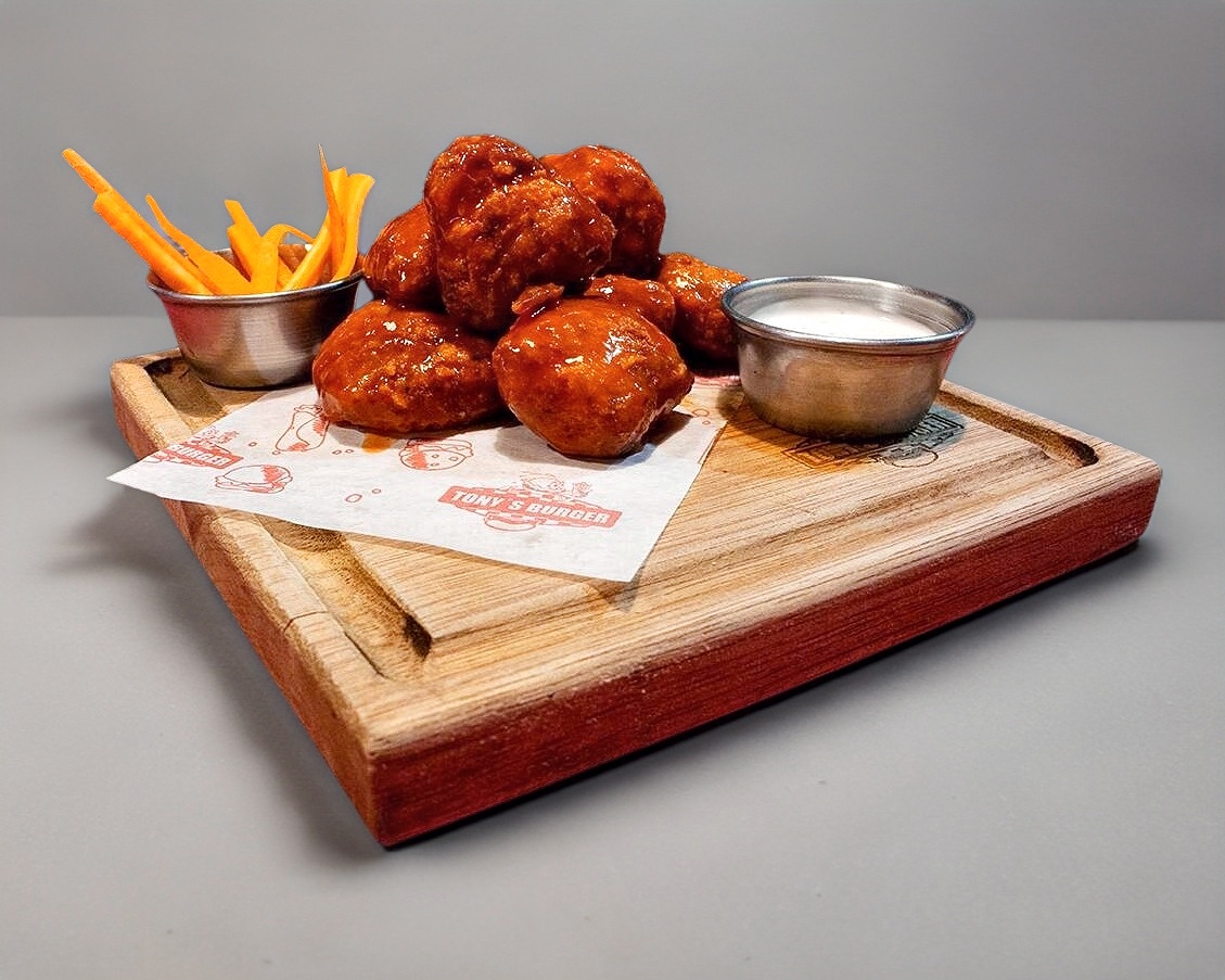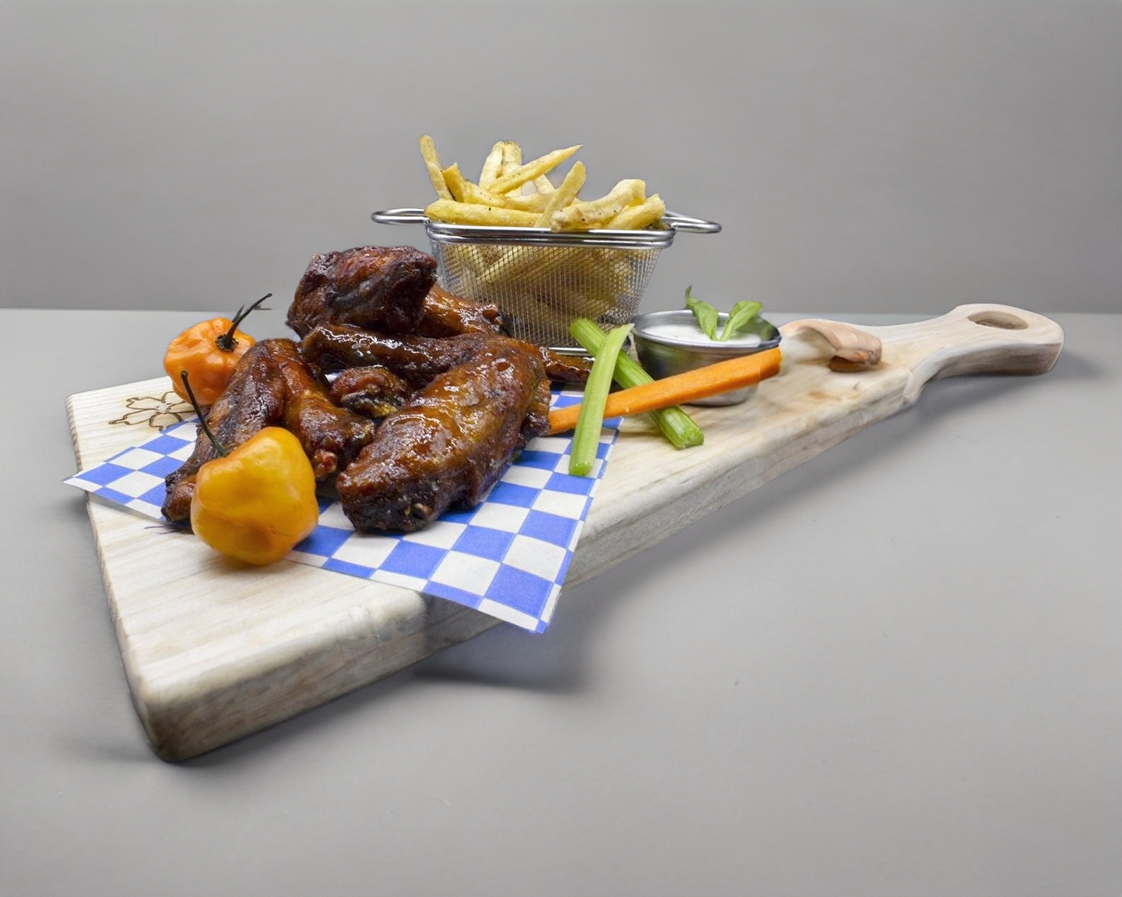 Con salsa BBQ, Bufalo, diabla, mango habanero, tamarindo habanero, tradicional y adobadas.
