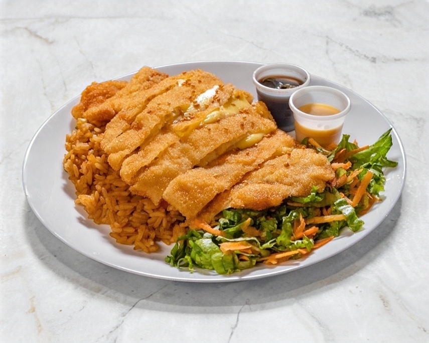 Pechuga rellena de queso manchego y Philadelphia (65 g), acompañada de arroz chino, ensalada de lechuga con zanahoria, soya con chiles y un sobre de salsa Valentina. (Porción personal)