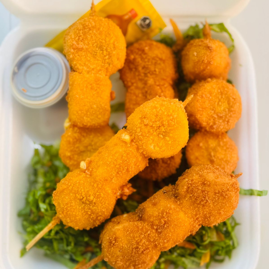 Brochetas de plátano macho con queso manchego 5 pzas con cama de ensalada (lechuga y zanahoria).