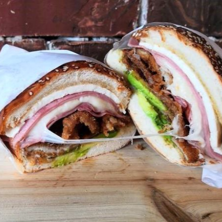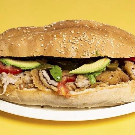 Milanesa, jamón, queso panela, quesillo, frijoles, mayonesa, aguacate, jitomate, cebolla, rajas con chipotle y lechuga.
